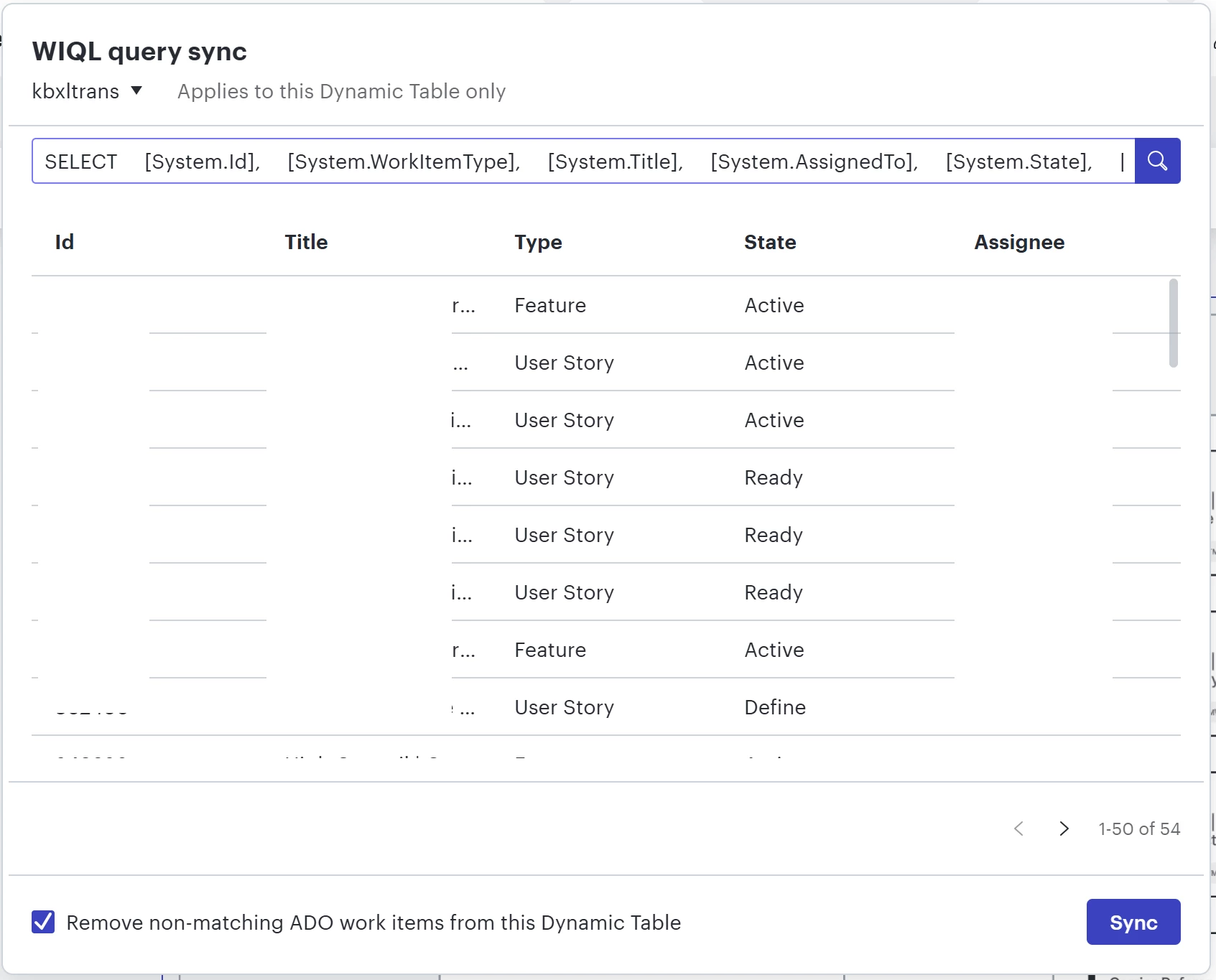 When synching a dynamic table with WIQL via Azure DevOps, it appears to leave out items that are not in the initial 50 items pulled in the query.
