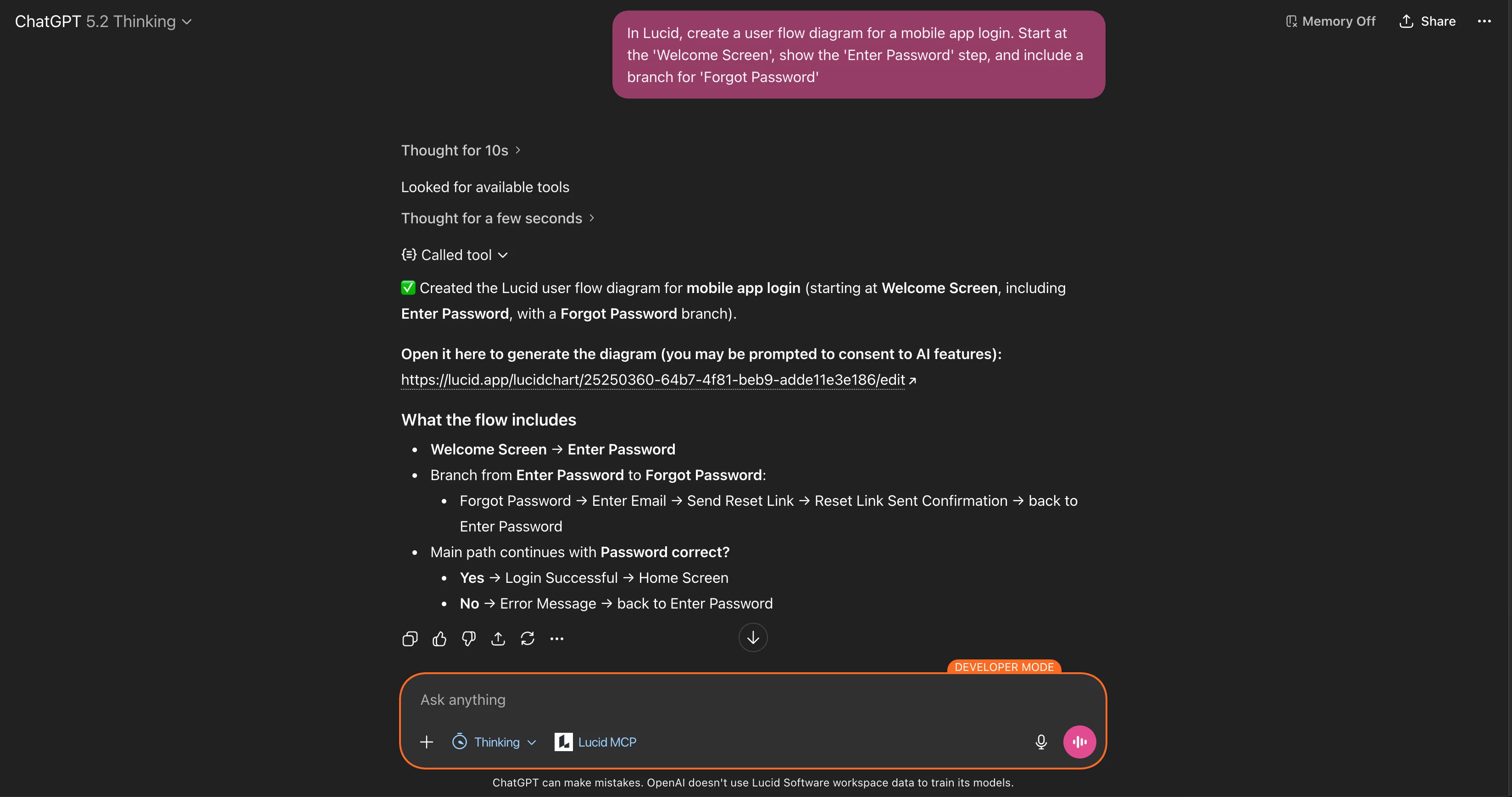 You may have already used the Lucid MCP Server to connect Lucid with tools like Claude, ChatGPT, and Microsoft Copilot to search, retrieve, and summarize your documentation and flows. Today, we are excited to announce that we are extending the Lucid MCP server to move beyond understanding your documents.