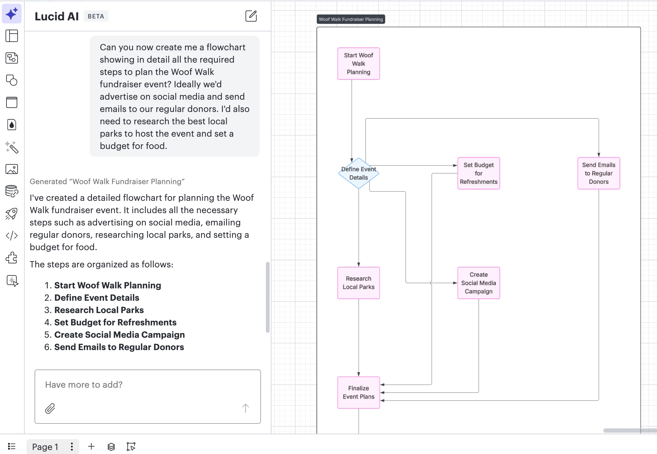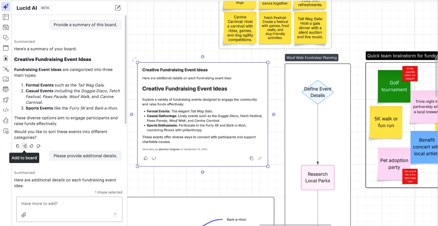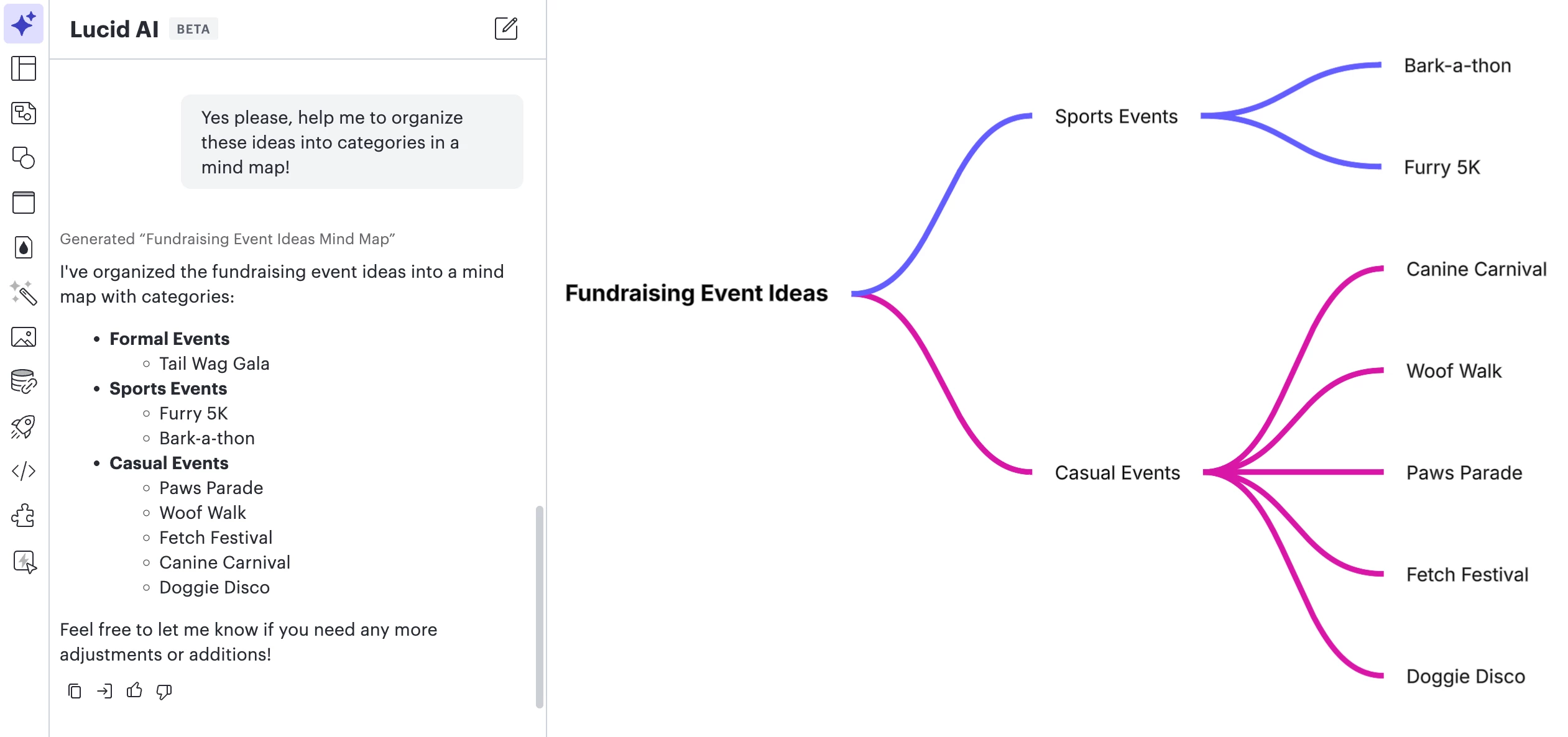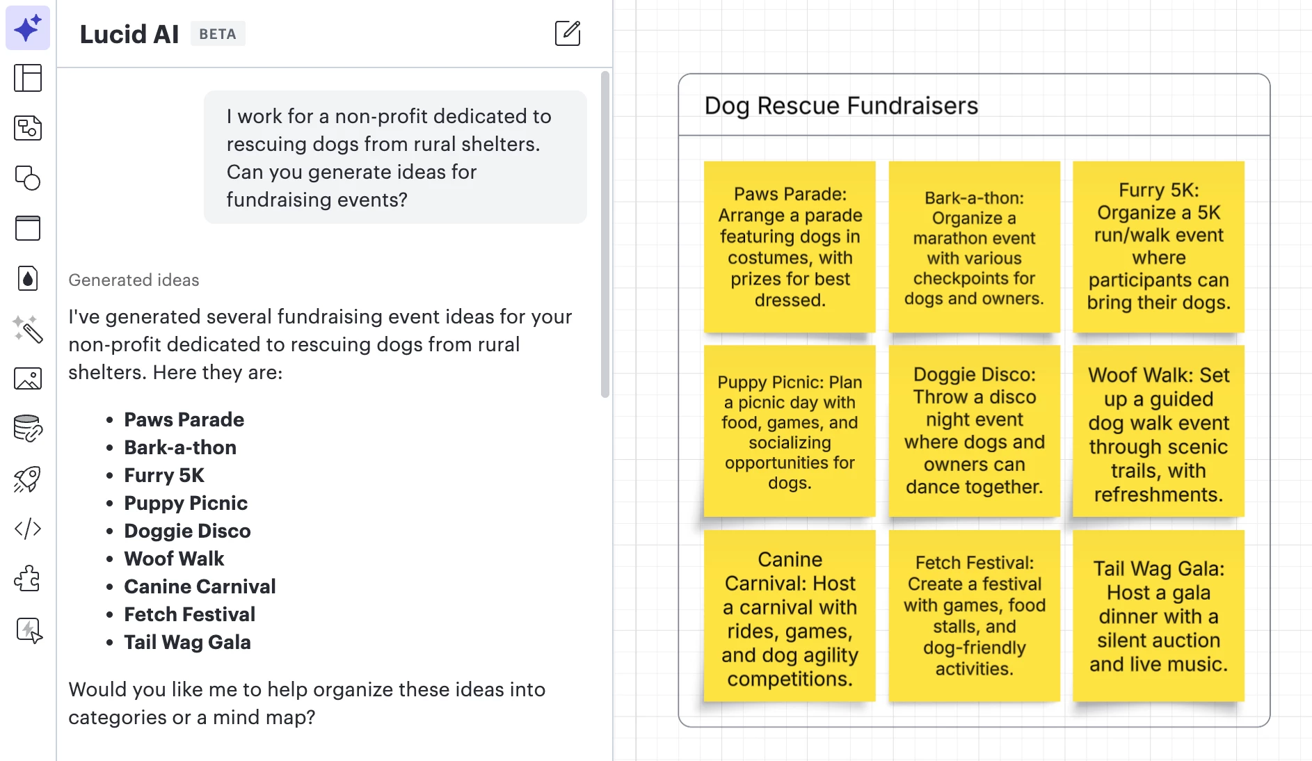 Now let’s take a look at how Lucid AI can help us generate ideas and create a plan of action. You can ask Lucid AI to brainstorm ideas for a fundraising event, for example, providing details on the objectives and goals to refine the suggestions. Don’t be afraid to ask for a new list or more details!