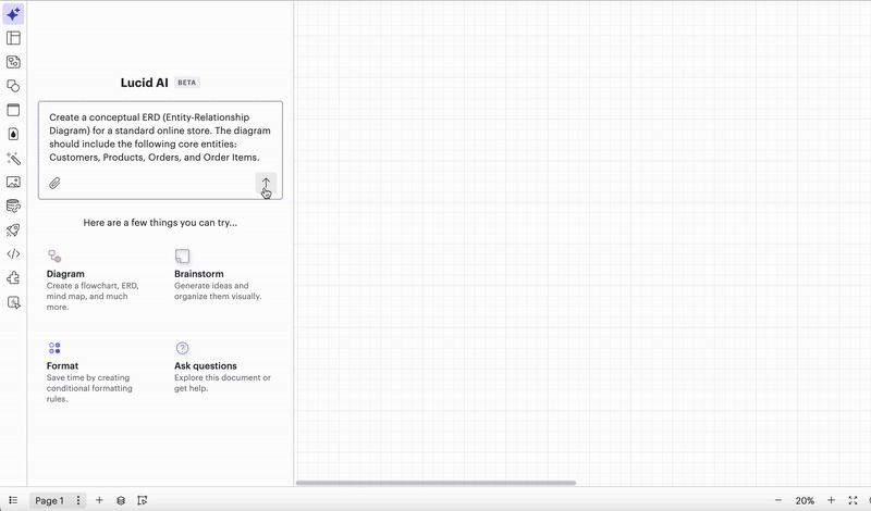 First let’s look at creating an Entity Relationship Diagram (ERD) diagram for an online store. Starting with a prompt, Lucid AI can generate the diagram and populate it directly on the Lucidchart canvas, creating a starting point for the ERD diagram.