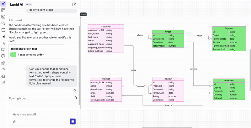 Edits to the diagram can be made manually or with additional prompts to Lucid AI. You can ask Lucid AI to change shapes, change relationships, expand on the diagram to include additional entities or attributes, and so much more.