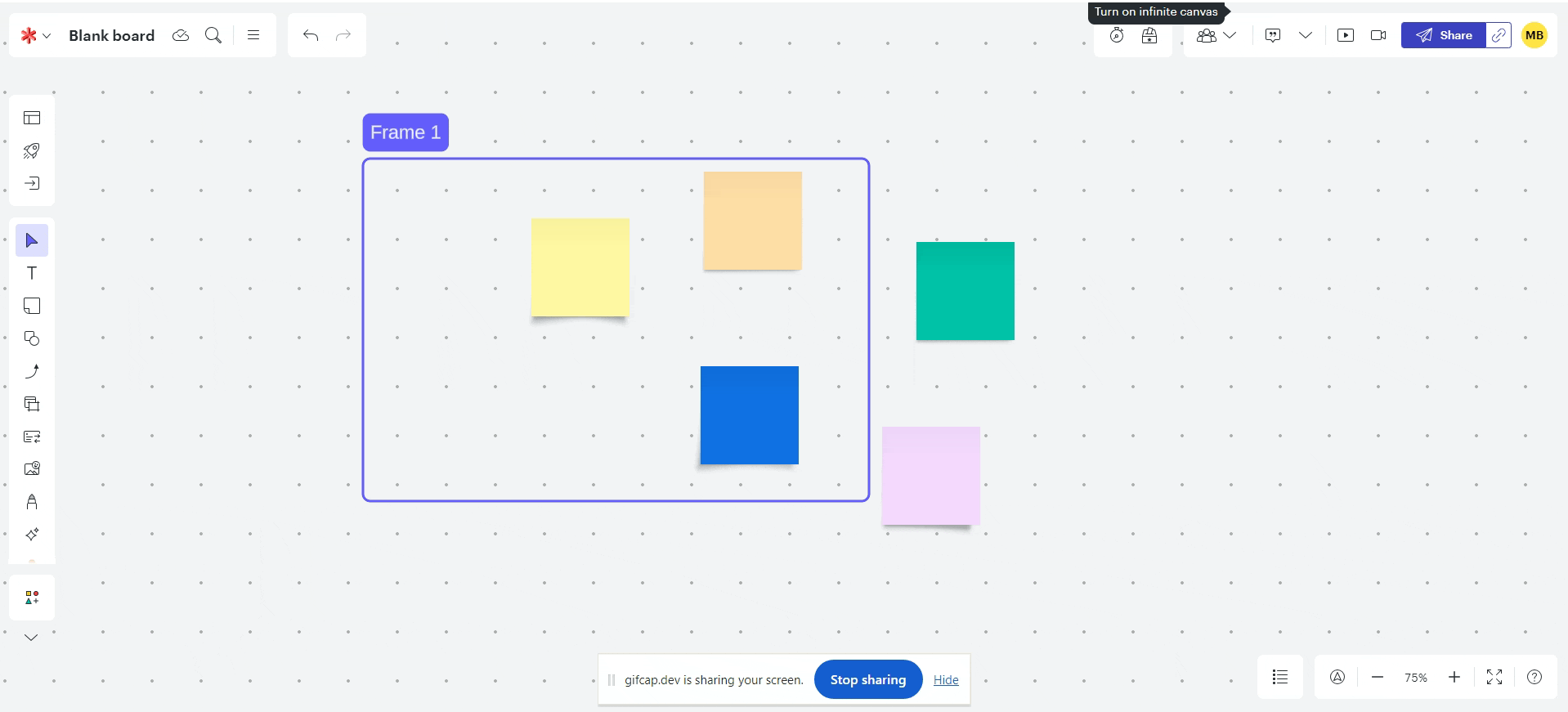 - Behavior in Miro: only frame entirely inside the box selection is selected but object touched by a box selection is selected even if it is not entirely inside the box