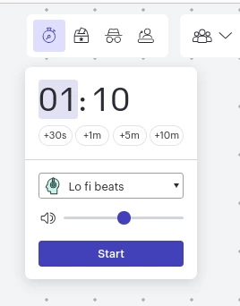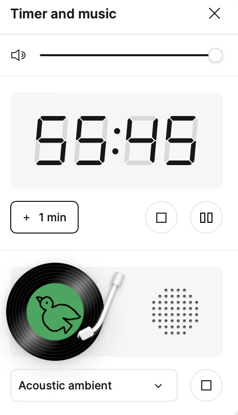 For my team, the usual use case for the music is during collaborative sessions (for example during a retro), in which we are usually on a group call using Zoom/Gsuite/Slack/etc and using the same Lucid board. While it is nice to have music in the background, we will usually want to chat/discuss stuff while the timer is active, and currently the music being locked to whatever the system volume is means that we struggle to hear each other speak. As as result we end up turning the music back off