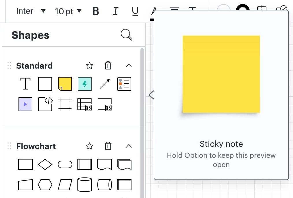 from the doc there seems to be an option to enter the text before the sticky note is added to my board by selecting the sticky note from the main left tool bar. However, the sticky note is not on my toolbar. I am in Lucid Chart. How can I add it to the left toolbar