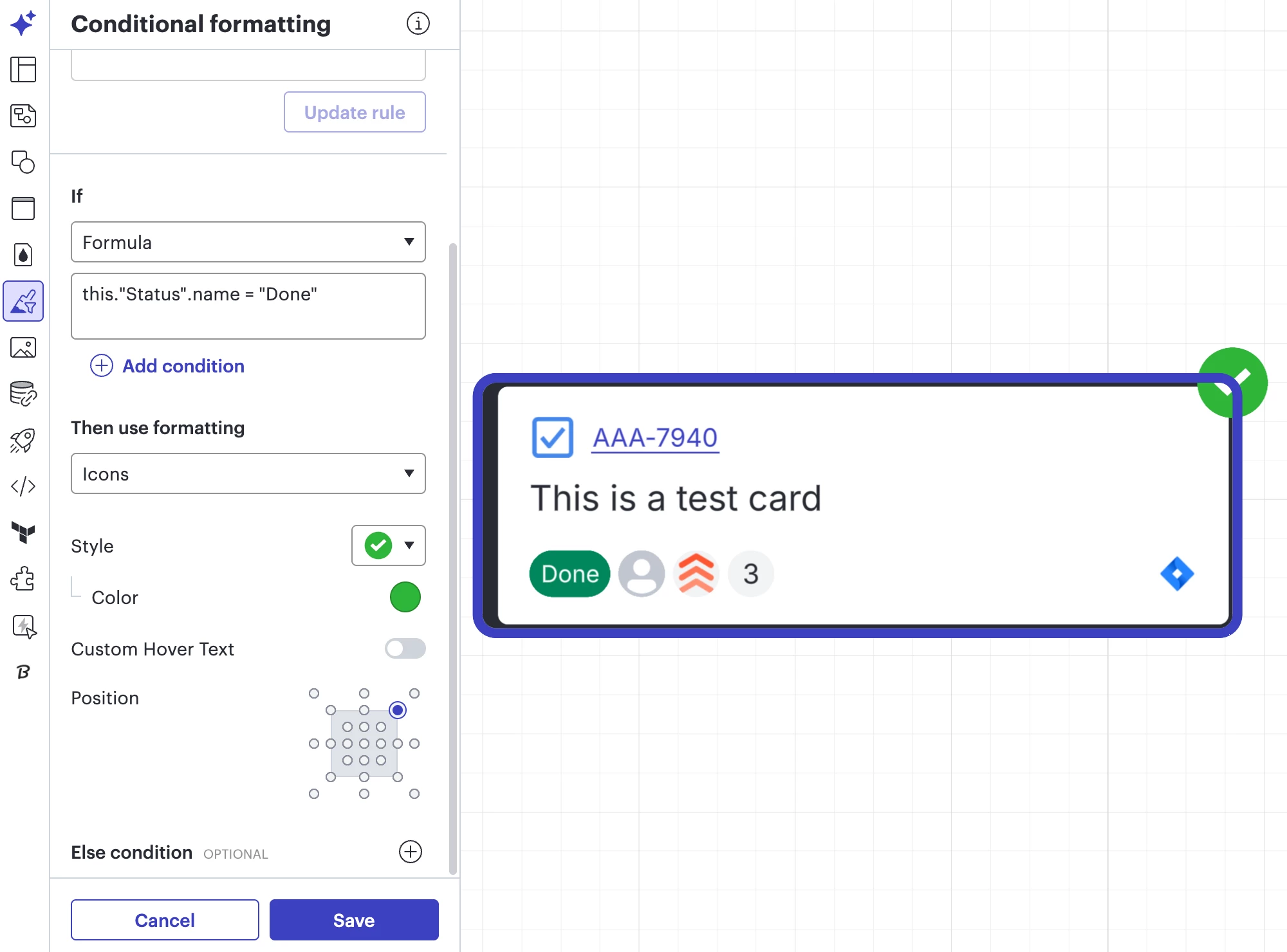 The other option that is currently available does not involve emojis, but I think you’ll be able to use this as a workaround that perhaps makes more sense for your use case. I suggest setting up conditional formatting rules so that cards with specific descriptions add an icon as shown below. To do so, you can follow these steps: