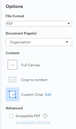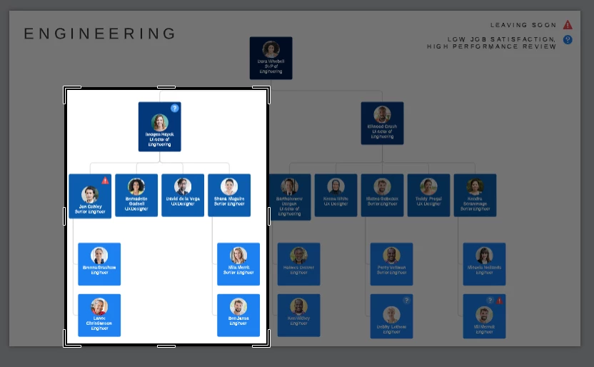 2. Export your document to a PDF file and use Lucidchart's Custom Crop option to select just the manager and direct reports you'd like to be included on a single page when printed. You can repeat this process multiple times to obtain a PDF of each branch of your org chart.