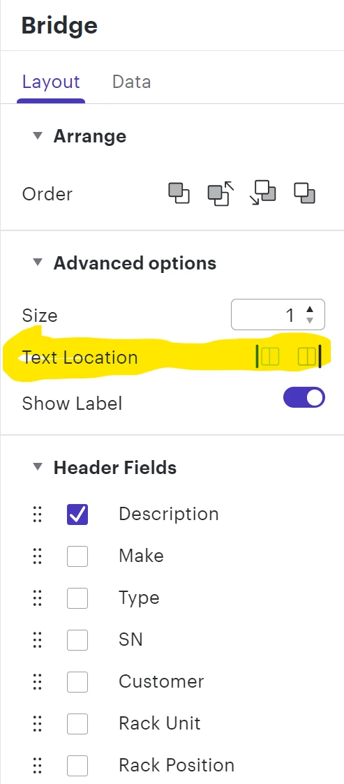 It is very helpful to have labels from the data fields showing up in the chart. Right now we have component’s labels that includes either description or hostname showing on the left side of the component, and all the blanks (empty spaces) showing elevation (rack position) on the right. It mostly works great, except when the whole rack is full with equipment. In that case we see all our equipment hostname labels on the left and no rack position. If we add second field as additional label from the datasheet the whole chart is not easily readable as the line wrapping makes it difficult to read. I would suggest to to enable fields label position per field. So, in essence I would like to enable and see my equipment hostname data field show up on the left side of the given component, and also have my rack elevation field (second field) to show on the right side of the same component. I hop[e it makes all sense. Right now under layout there is a text location left/right option which applies to all the header fields. The only option in the individual header field is to show/hide labels. Please add text location to the individual fields, so it can override the global top level setting if needed.