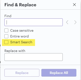 I can’t find a conveniently placed explanation that says what the Smart Search does. It would be helpful if there was some help text available from the Find & Replace dialog box.