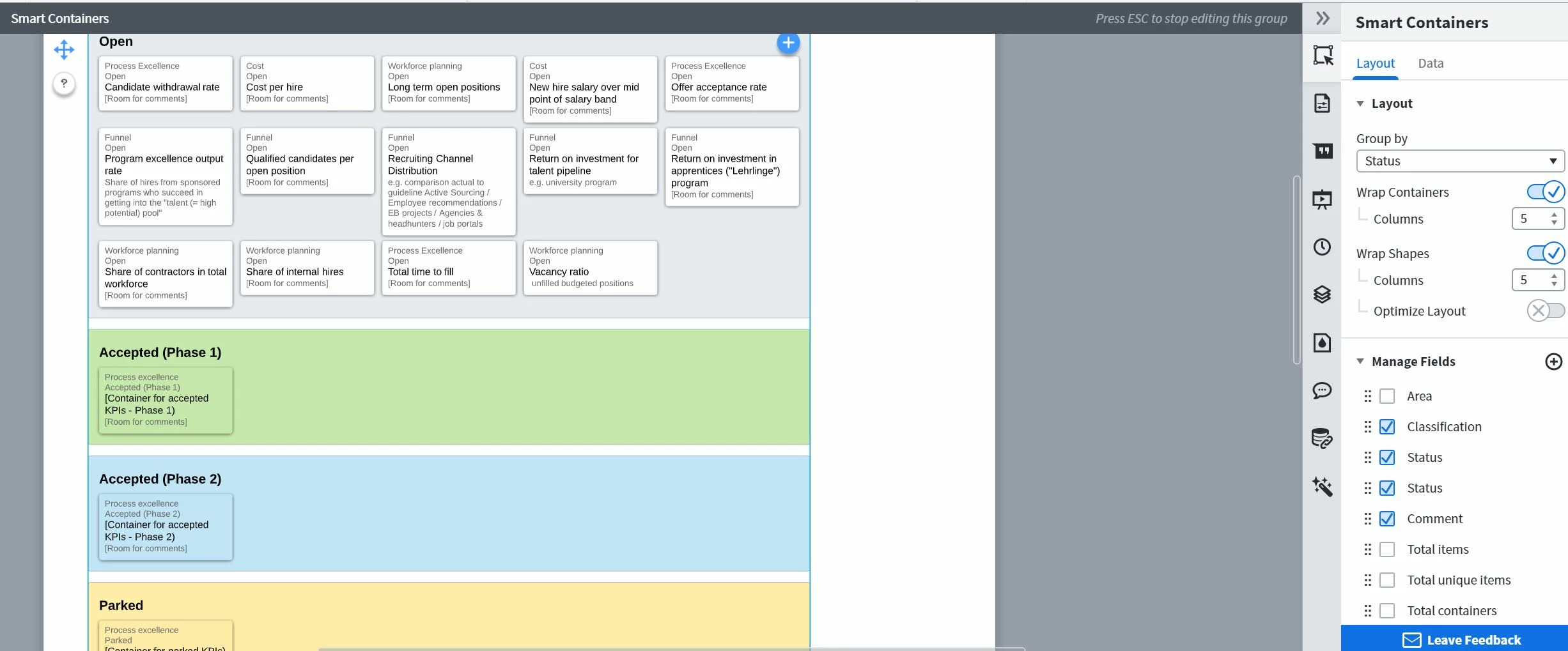 I use smart containers to visualize a list where each record has 4 dimensions (name status classification and comment).
