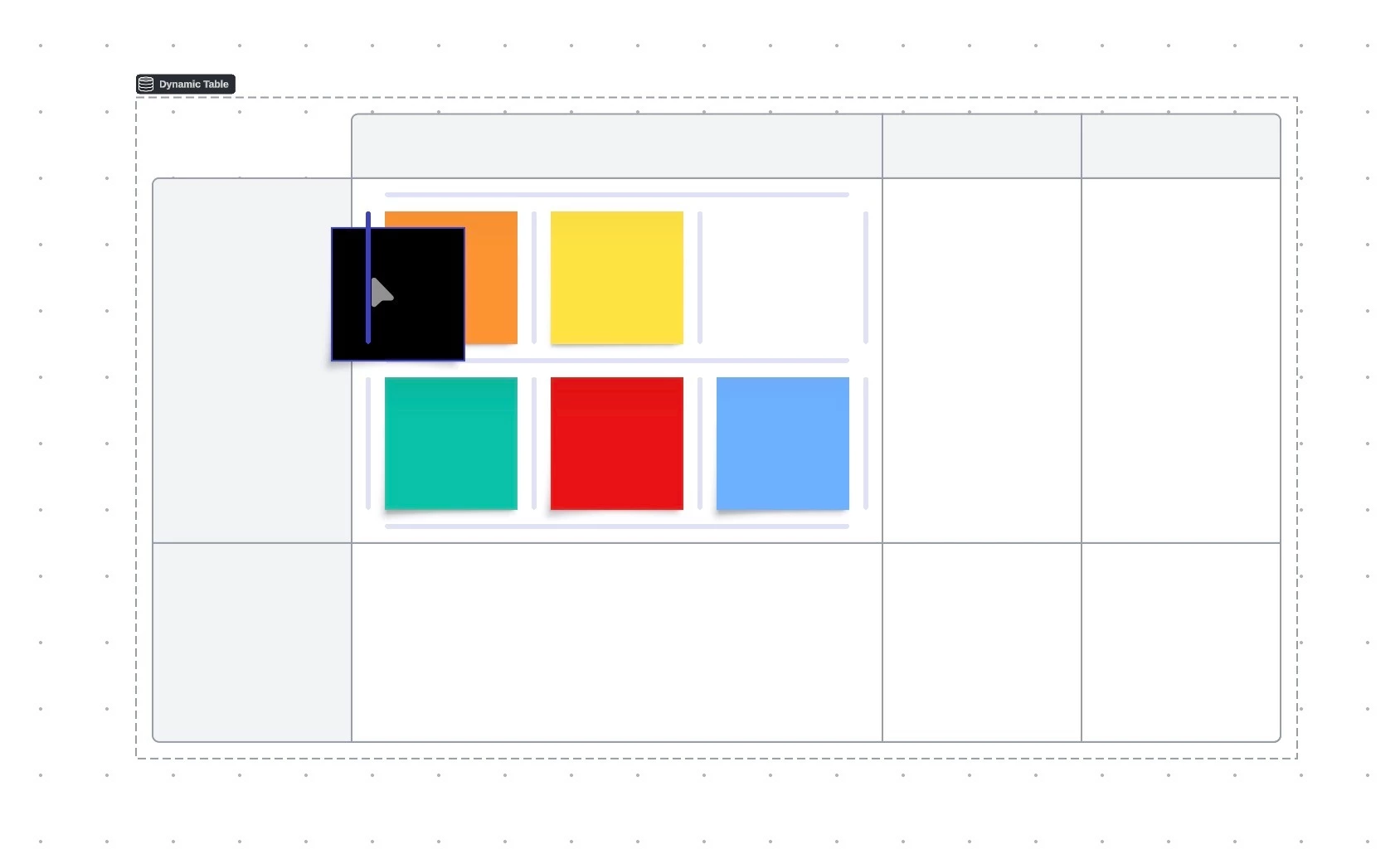This issue doesn’t exist in the dynamic table. You create two rows of sticky notes. Make each sticky note on the first row a different color. Make each sticky note on the second row a different color. Now move any color sticky note from either the top or bottom row in between two other sticky notes on the same row so the indicator line appears and the remaining ones will move down the line without affecting the other row and making the cell/grid/space extend longer.