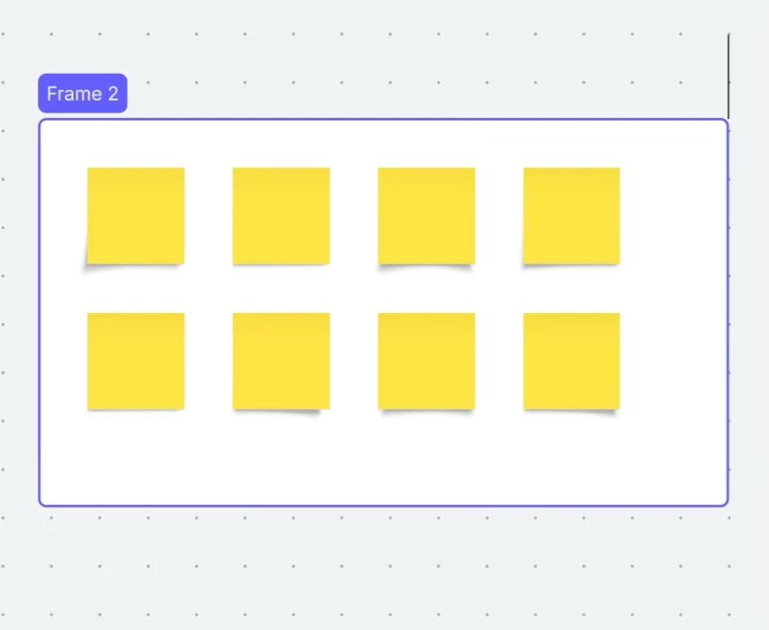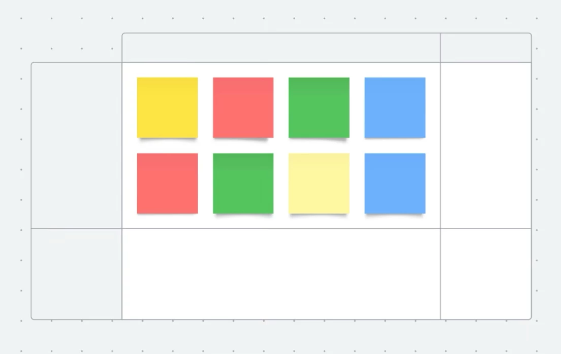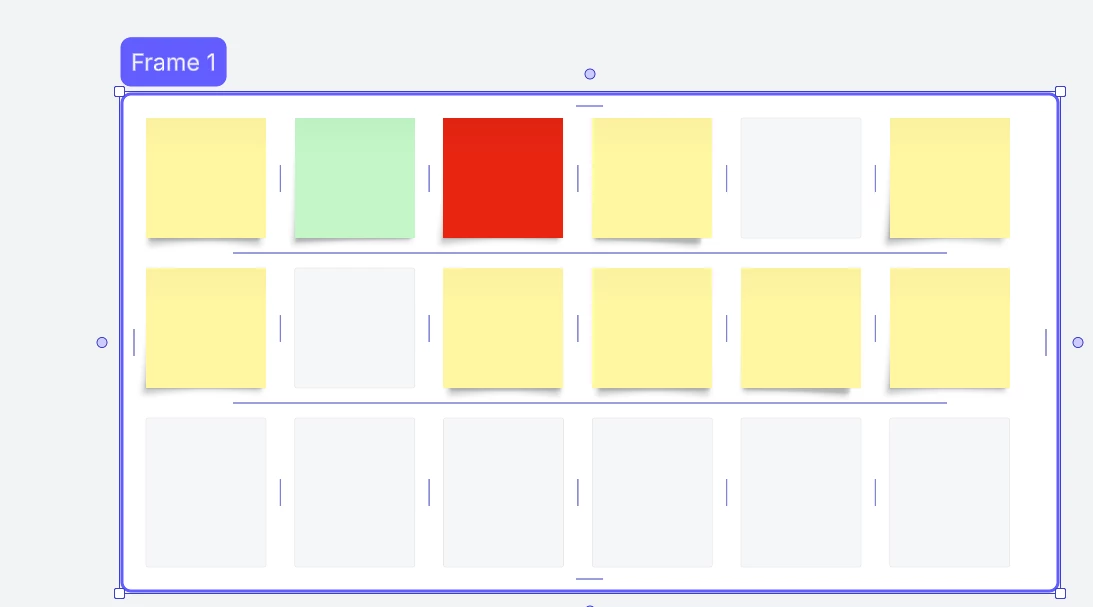One wrong move could mean you accidentally move a sticky note between two other sticky notes and now the frame expands. The grid of squares is there but so is the line between them when moving a sticky note around. Another wrong move could mean you move a sticky note and accidentally drag the side widening it- this will expand the frame as well. There is the span cell option but we can still manually drag on the sides and corners of a sticky note. This is what causes the problem. Widening the sides or corners of a sticky note will also change the grey placeholders inside the frame or container from square to rectangle. If you just using the span cells option the square placeholders stay intact. But all it takes is one accident.