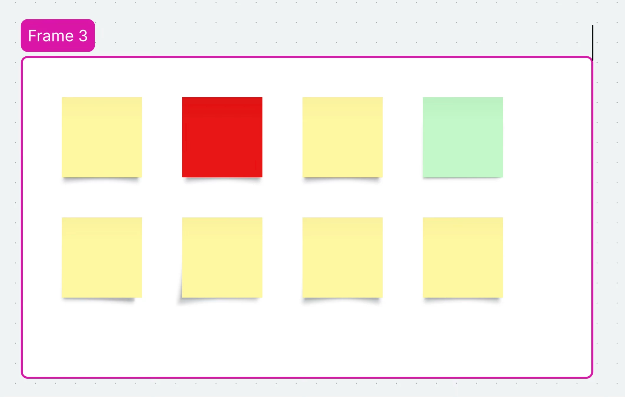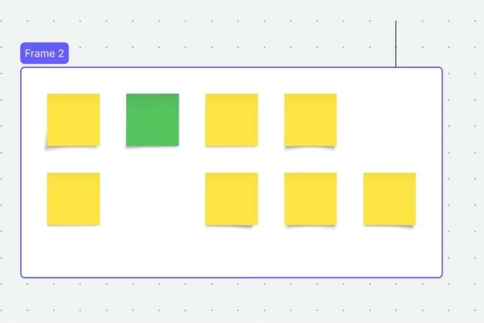 I am using a MacBook Pro. I am using the web app in Apple Safari. I am using Lucidspark. Zoom level 100% I add a frame to the board. I change the aspect ratio from Custom to 16:9 I click on Assisted Layout in the bottom right corner of the frame. Manual sizing is chosen. I add a banana colored sticky note to the far left side on the top row of the frame. I press Tab and duplicate three more sticky notes. I add a banana colored sticky note to the far left side on the bottom row of the frame. I press Tab and duplicate three more sticky notes. Eight banana colored sticky notes are in the frame. I take a vertical divider and align it to the top right corner of the frame so its sticking up. I take the far right sticky note on the top row of the frame and change it from banana colored to pistachio. I take the second stick note on the top row and change it to red. I take the pistachio colored sticky note and move it over the red sticky note. This move will have the two sticky notes swap places. I put everything back in its original place. Banana. Red. Banana. Pistachio. I take the pistachio colored sticky note and move it between the first banana colored sticky note and the red one. An indicator line appears. This is where the issue occurs. The pistachio colored sticky note now takes the second spot. The red one takes the third spot and the other banana colored sticky note takes the last spot. This move affects the bottom row for some reason creating an empty spot in the second spot plus extending the right side of the frame beyond the vertical divider.