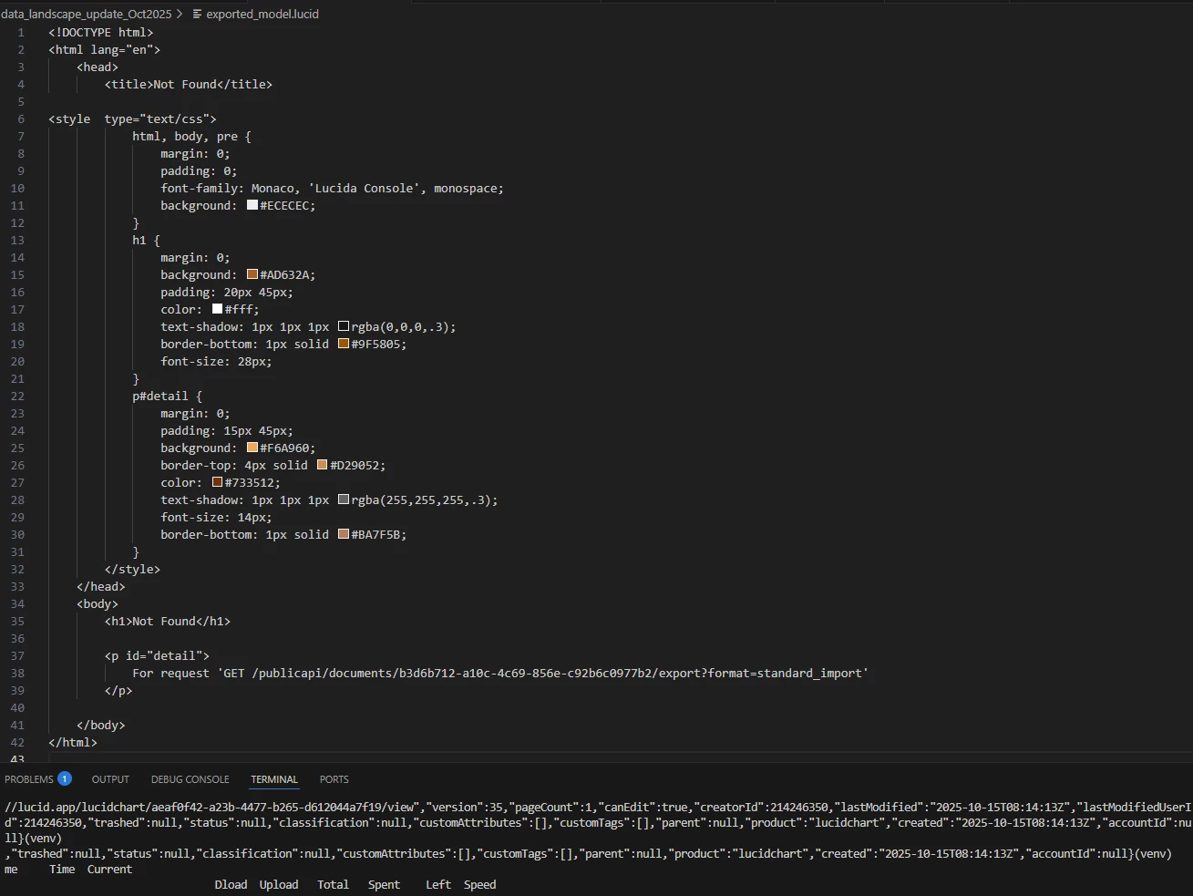 I could receive it, although without the JSON itself with this call: curl -X GET "https://api.lucid.co/documents/b3d6b712-a10c-4c69-856e-c92b6c0977b2/export?format=standard_import" -H "Authorization: Bearer $LUCID_API_TOKEN" -H "Lucid-Api-Version: 1" -o exported_model.lucid