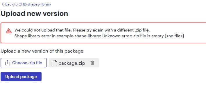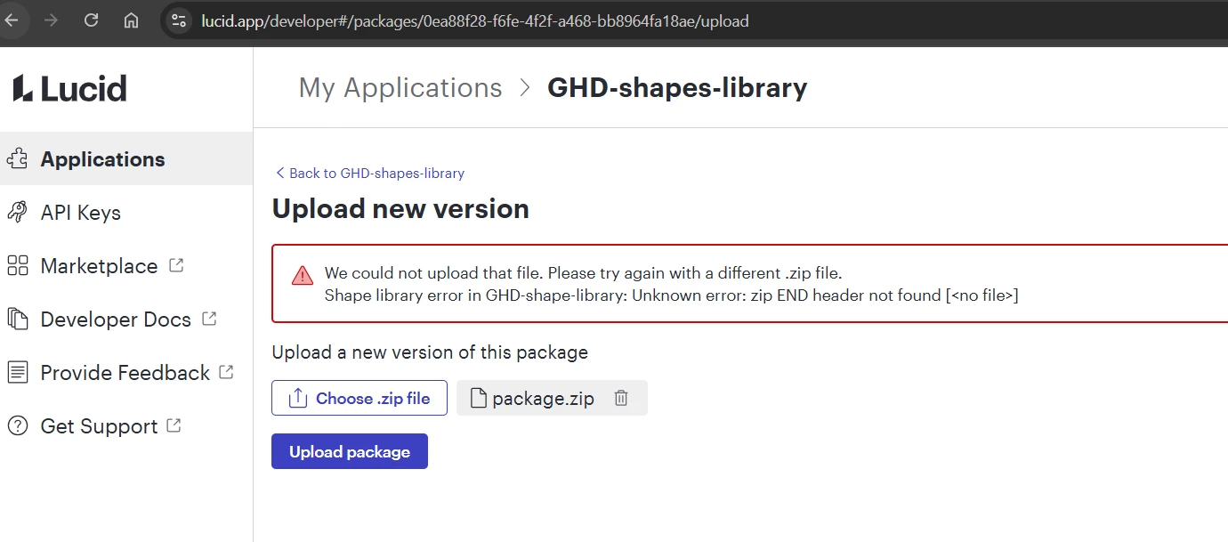 I'm trying to upload a custom shape library (XYZ-shape-library, based on example-shape-library from GitHub) to the Lucid Developer Portal for our enterprise instance. Using npx lucid-package bundle on Windows, but getting error on Developer portal while uploading zip package that i created using npx lucid-package@latest bundle ---