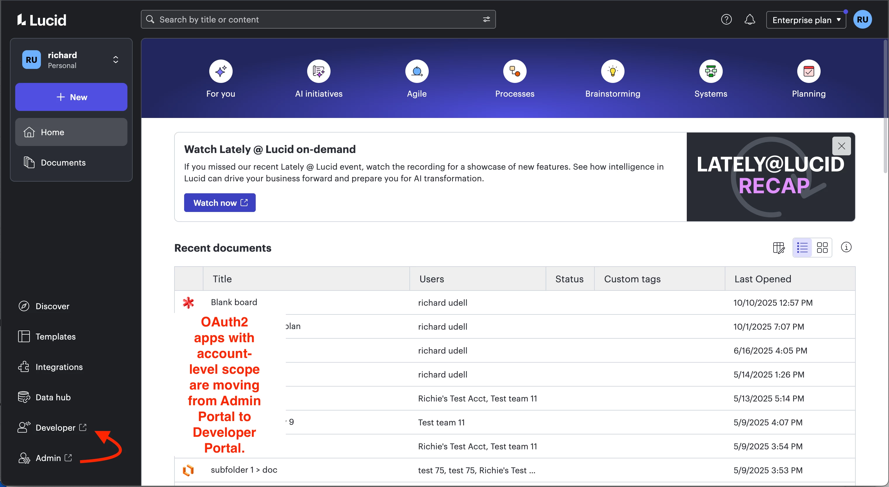 - If you need to manage your clients in the dev portal, make sure developer tools are enabled first. For an end user to access the dev portal, they need to enable a user setting (https://lucid.app/user#/settings) > Developer Settings > check Enable Developer tools is enabled.