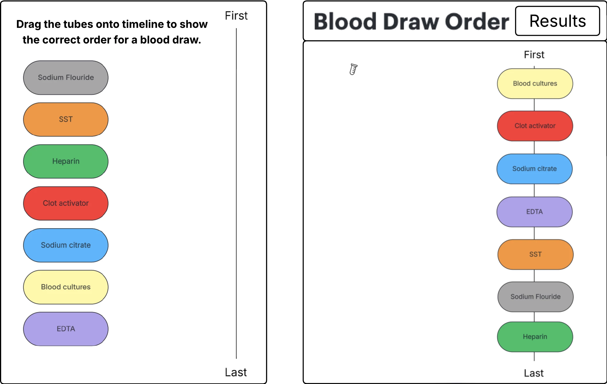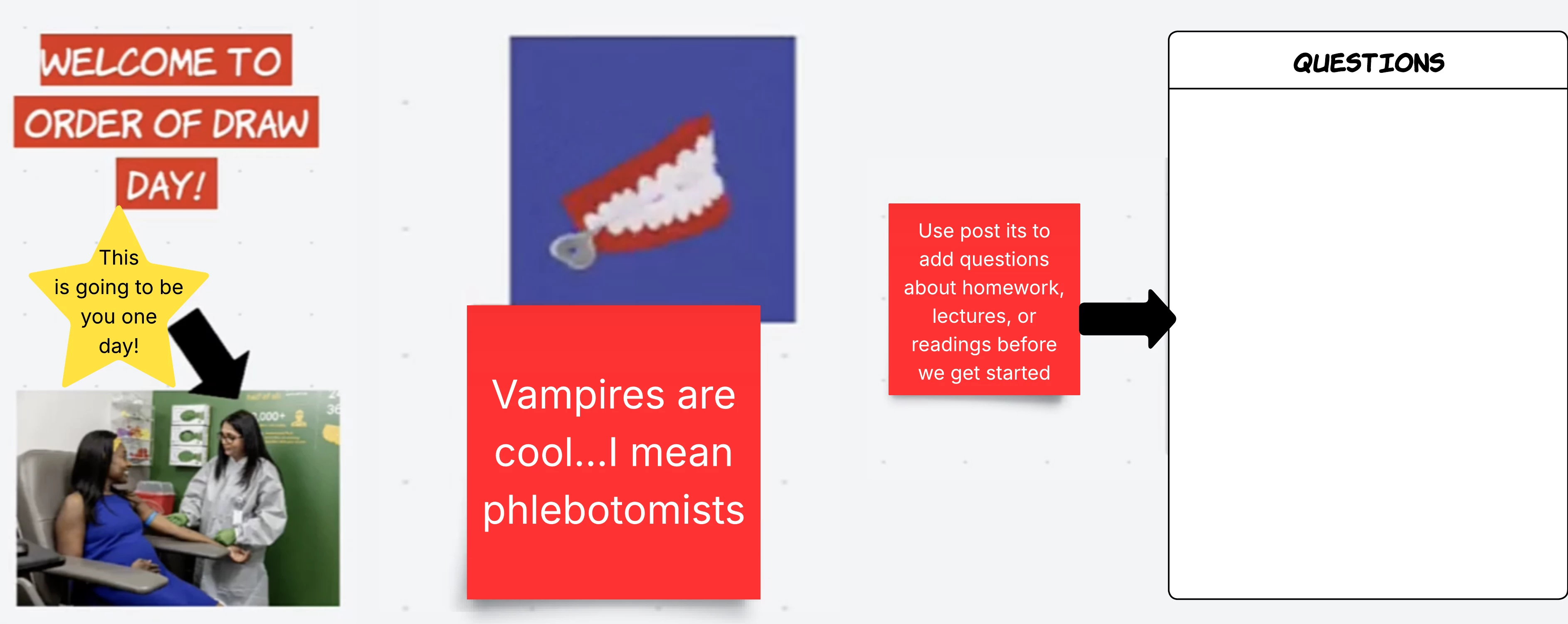As Corey thinks about how to use Lucid to engage students she immediately thought about using it for a fun, but informative bell ringer activity to kickstart a phlebotomy lesson. She put together the following bell ringer that can be used for both in-person and online classes.