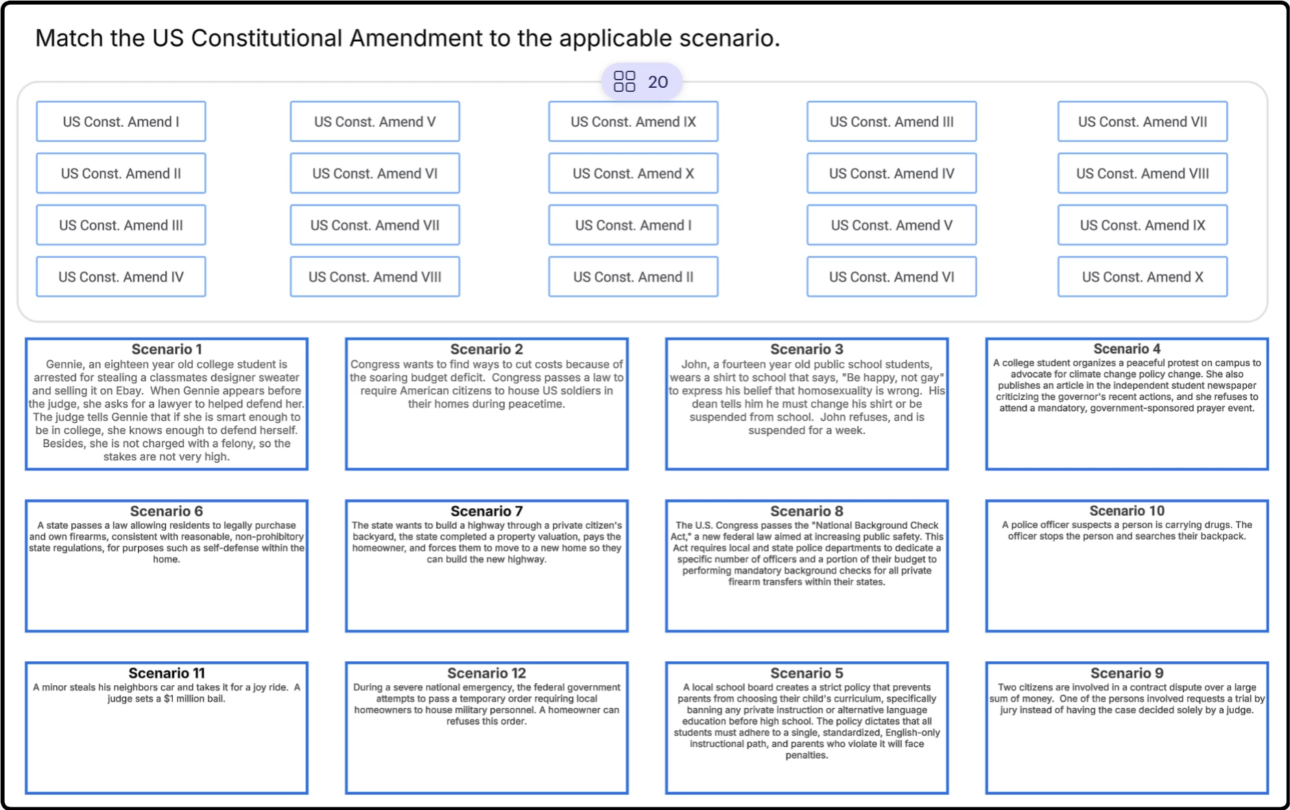 Lisa uses a drag and drop matching game in History 101 to give students a chance to apply their learning to real life scenarios. In this activity, students analyze each scenario, research and then discuss and match the most appropriate US Constitutional Amendment to each scenario.