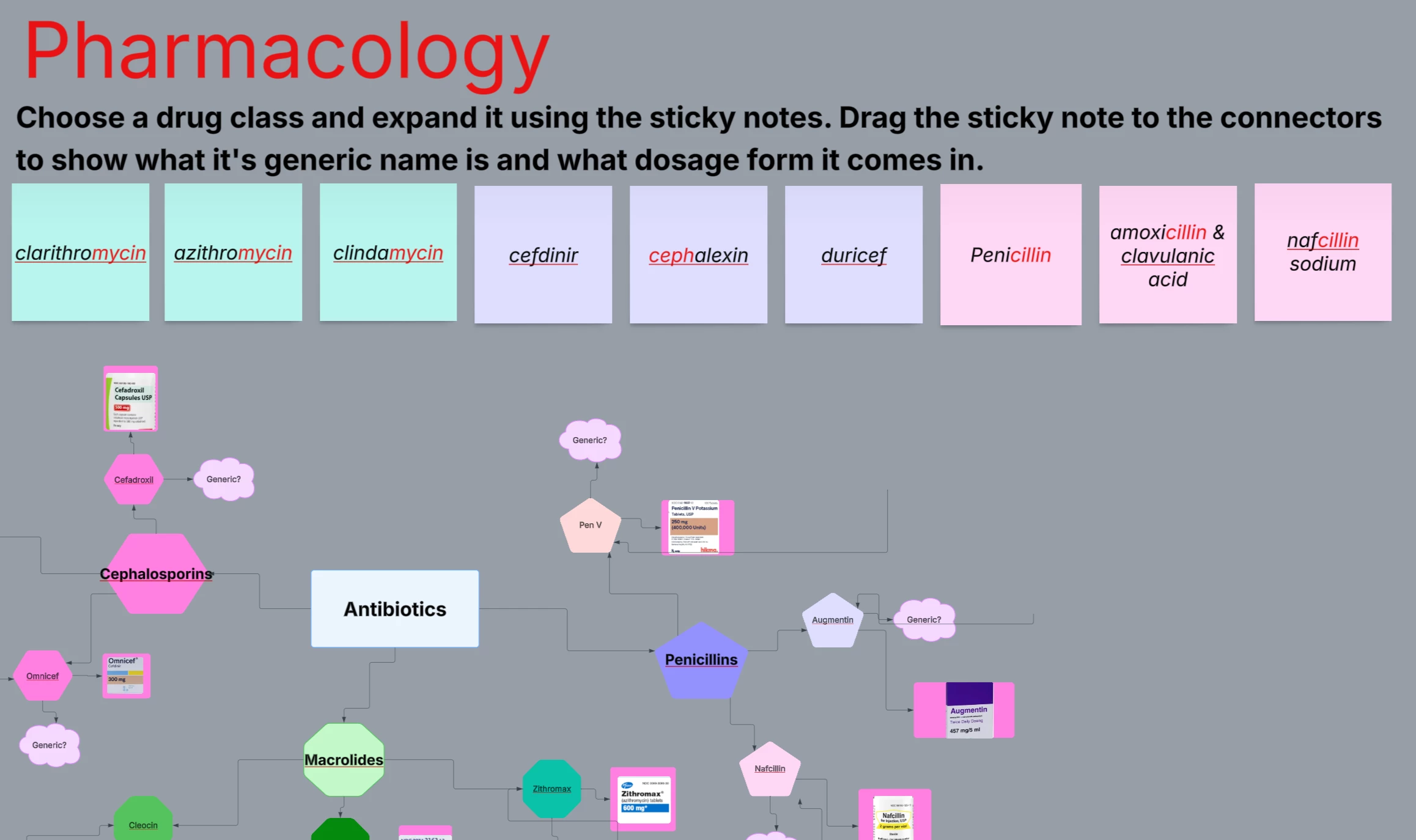 For this activity, students are learning about the different classes of antibiotics. All of the drug classes are listed on the concept map and all of the medications are listed on sticky notes across the top. Each student gets their own copy of the activity and they drag each of the medications into the correct category of the concept map. Lastly, they turn it in and review the correct placement for each of the medications.