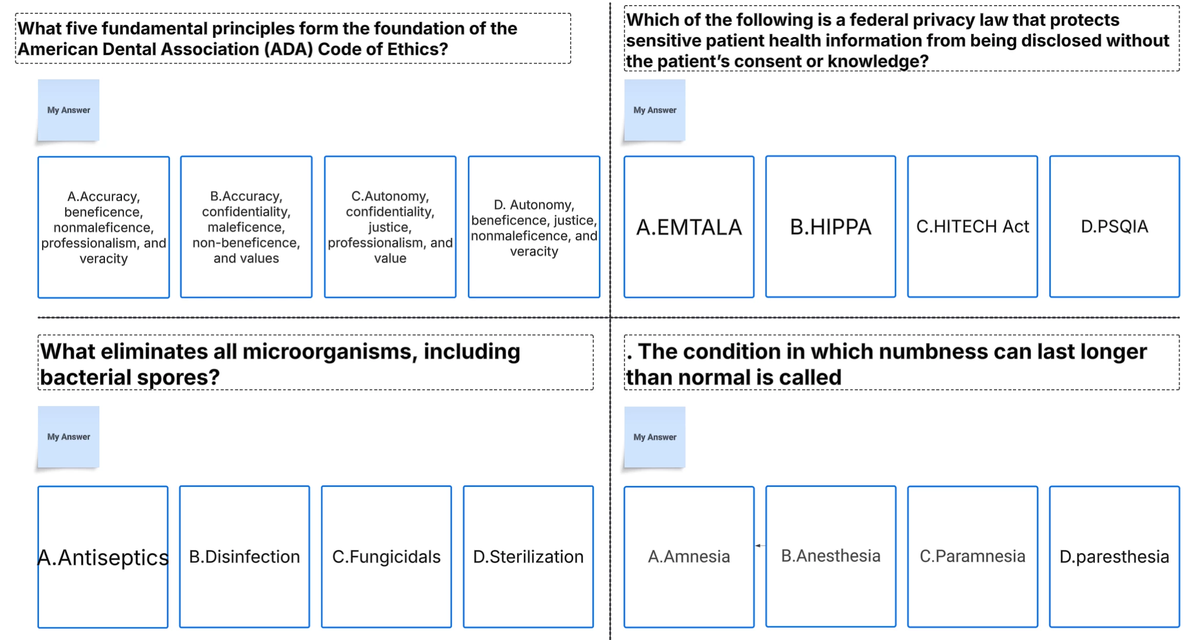 Hello! In the Dental Assisting program here at NCC, our students take the RDA exam, which is their registered state licensure exam. We focus on preparing them as early as Module 104, so they feel confident and ready by the time they reach Module 107. One strategy I’ve implemented with my advanced class is incorporating consistent activities related to the RDA exam to better support their learning and retention. With this Lucid activity, I’ve selected questions directly from their RDA study guides and grouped them by section to help students study more effectively and retain the material.