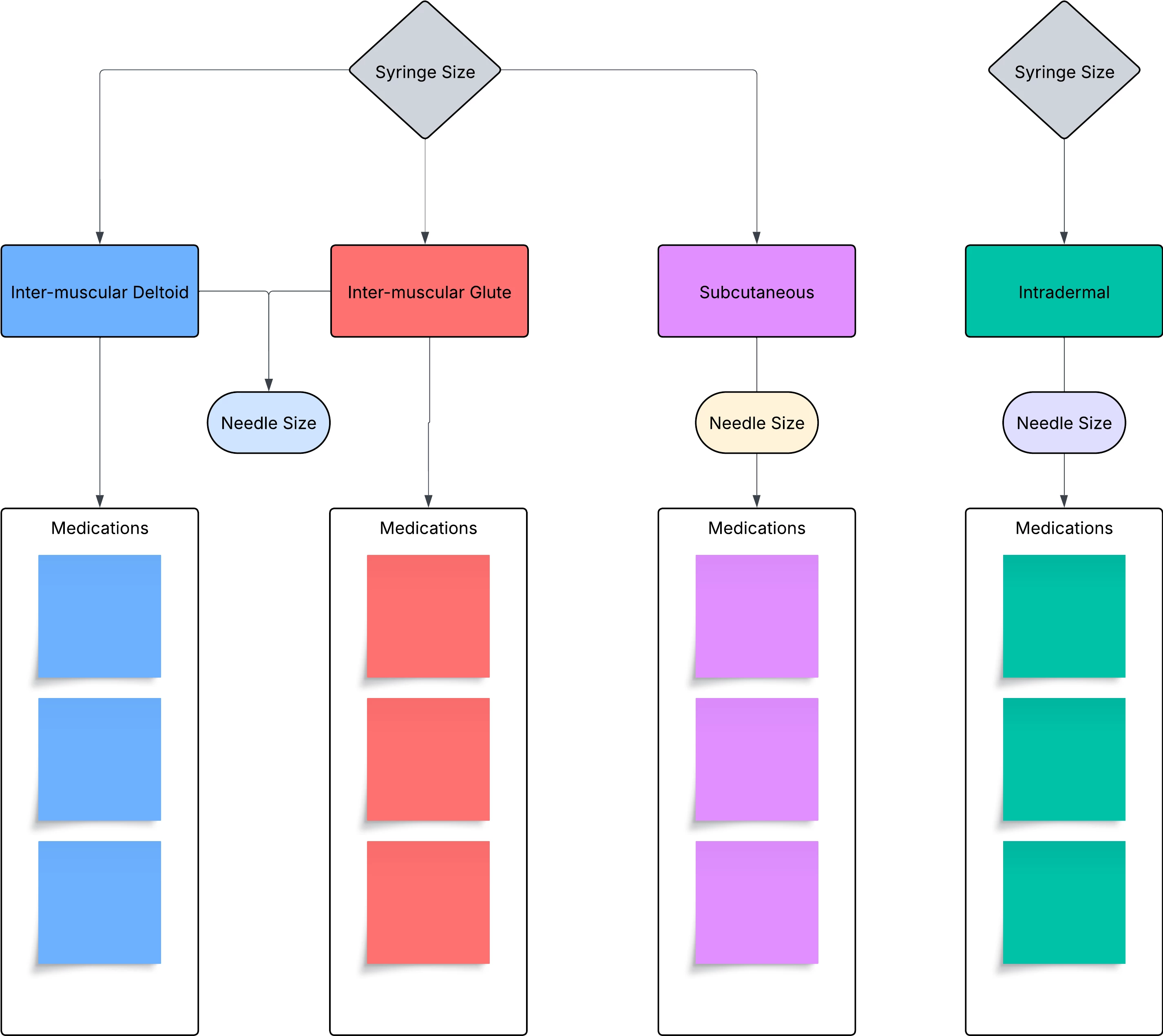 Aaron uses Lucidchart to help students layout and visualize the process for medication administration: connecting syringe size, needle size, and injection location. Students often struggle with keeping track of which administration process they should use for each of the different medications they are studying. This activity allows students to engage in a hands-on learning activity and once completed and reviewed gives them a reference document to help them in the future.