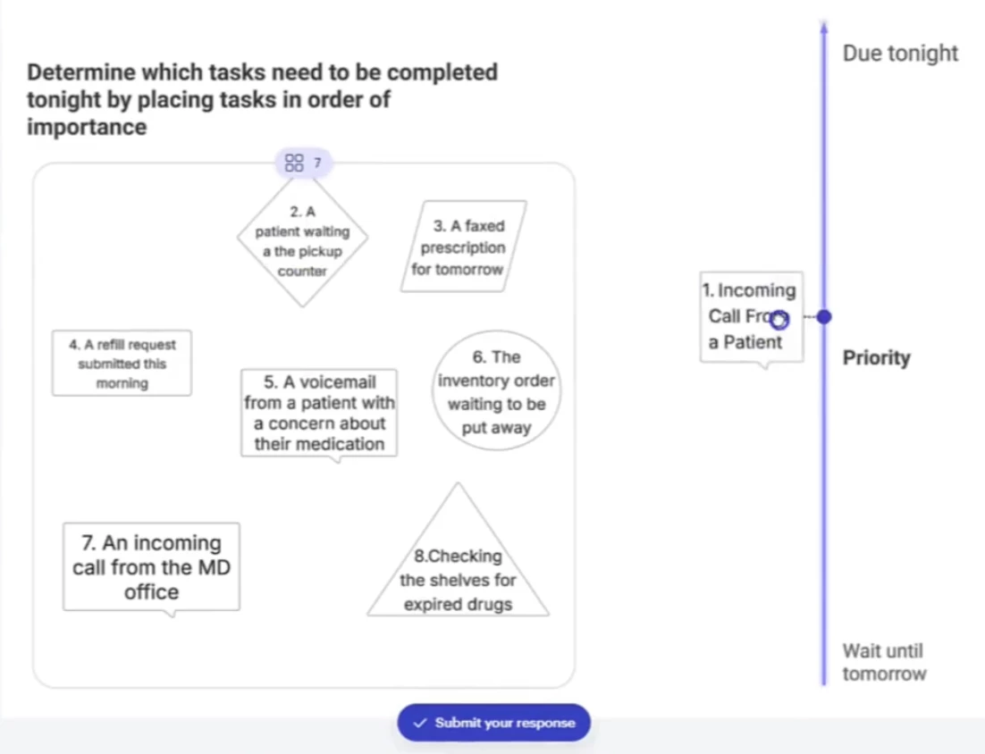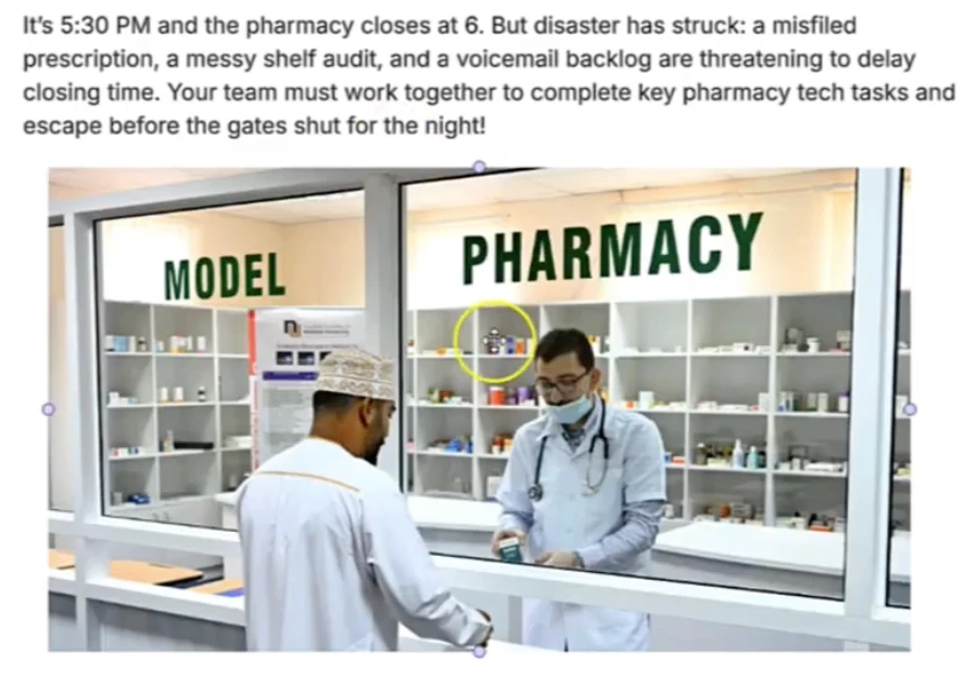 Then, students work through several pharmacy specific tasks to solve the problem and “break out of the room.”