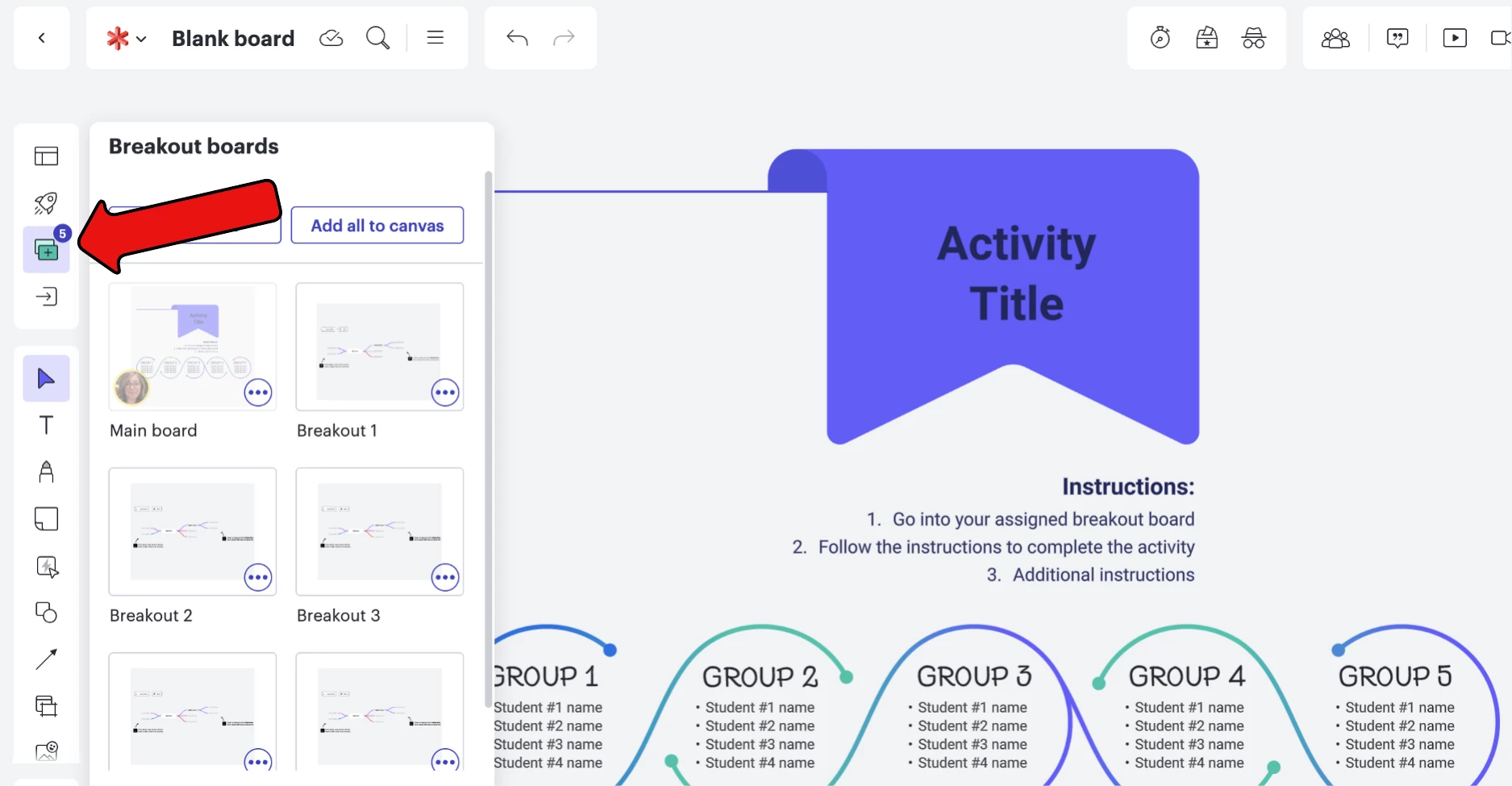 Some instructors will copy the share-link using the blue share button in the upper righthand corner of the main board and paste that in the RCE as a back-up for students. Here is a walkthrough of how they should access the breakout boards and how to add the backup link.