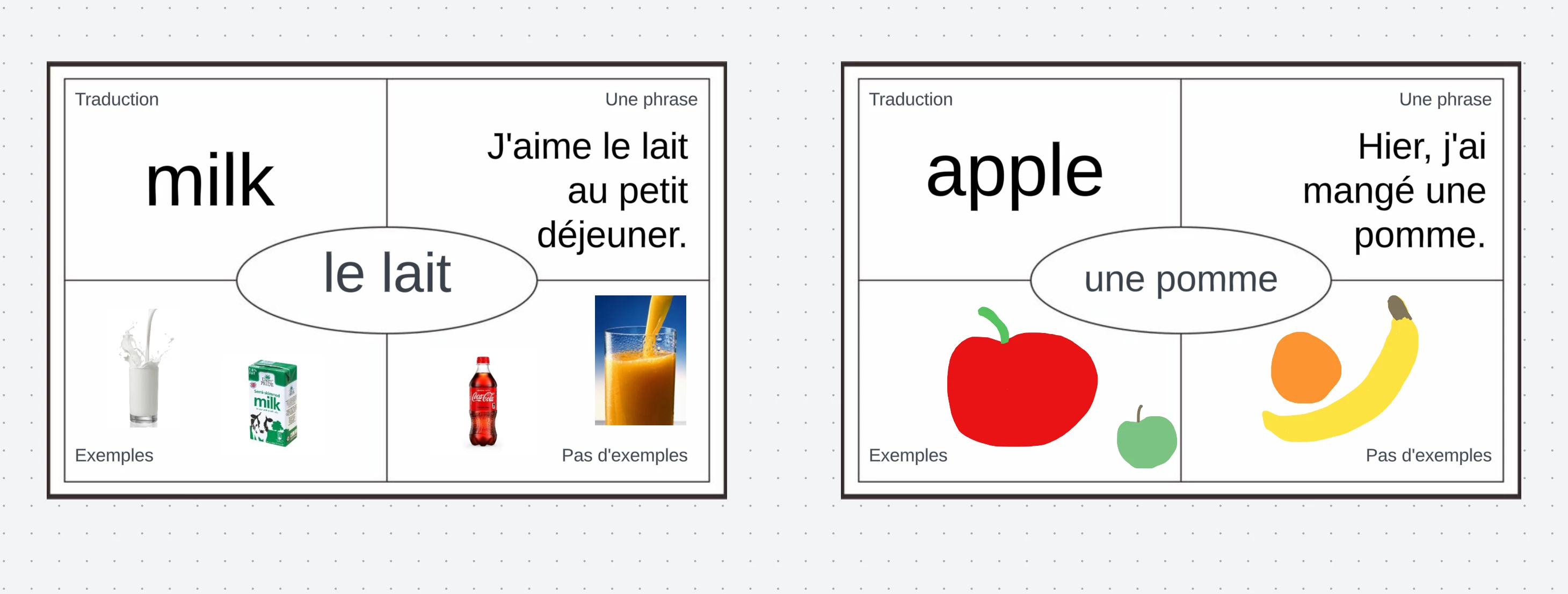 Here are some filled-in examples in French - one using Lucidspark’s image search option and one using Lucidspark’s Pen (freehand drawing) option: