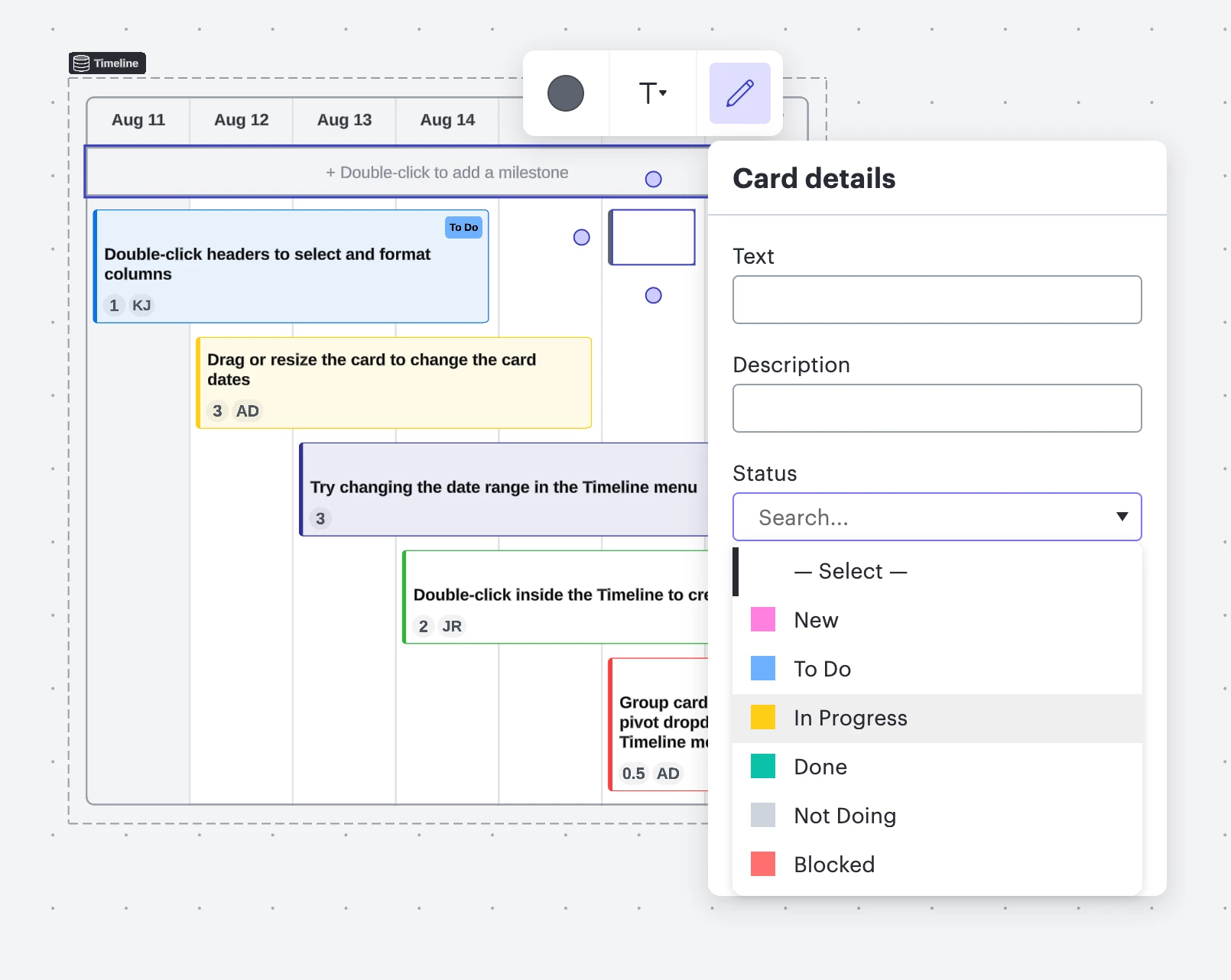 I want to better understand what you are experiencing. Are you using Lucidchart or Lucidspark? Here is a screenshot of the different status options I’m seeing in a card on a timeline, but I want to make sure that I’m looking at the same thing as you. Once I know where you are, then I can dig further and see if there is a customizable option.