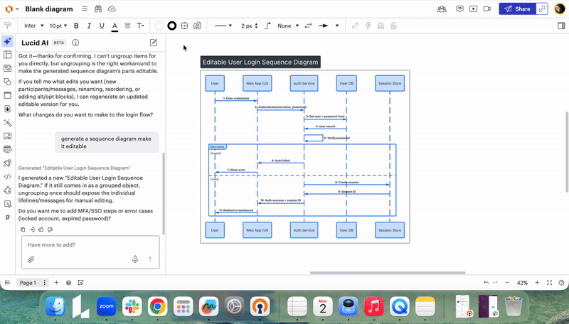 Hello used lucid AI to create a sequence diagram, but I cannot edit it - change the names, move the arrows around, add new arrows and text, etc. The AI chatbot says it made it editable for me. How can I edit a lucid AI generated diagram? this seems to just be an image, not the individual elements, not very useful IMHO.