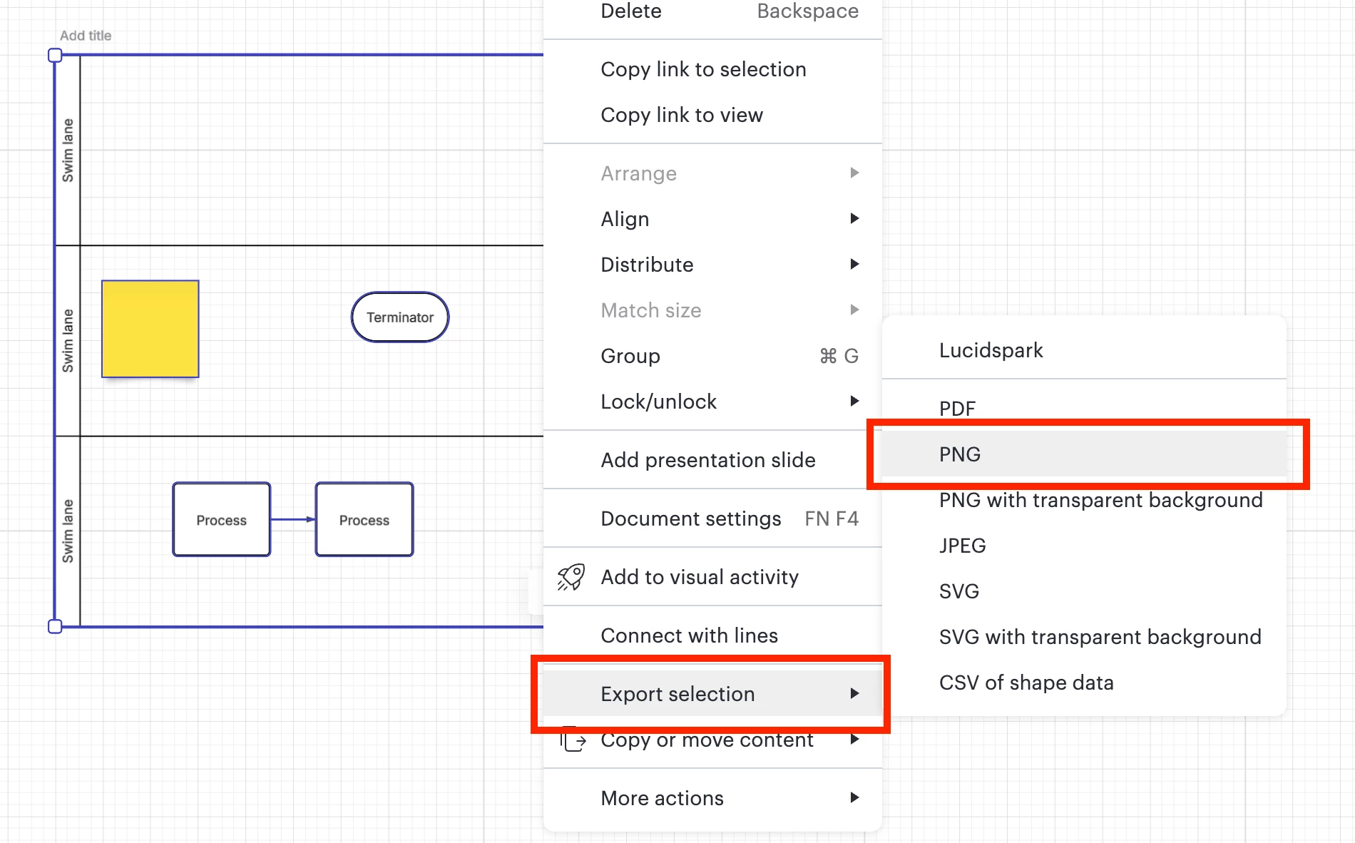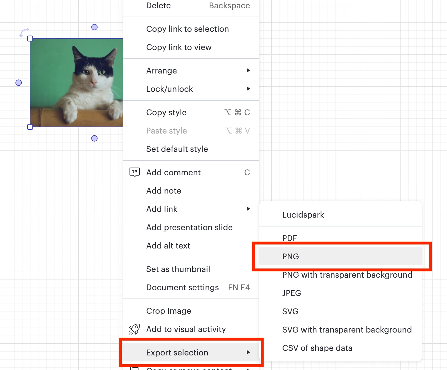 Select → copy → paste to document (Intuitive, convenient and supported by many other competitive tools but not Lucid)
