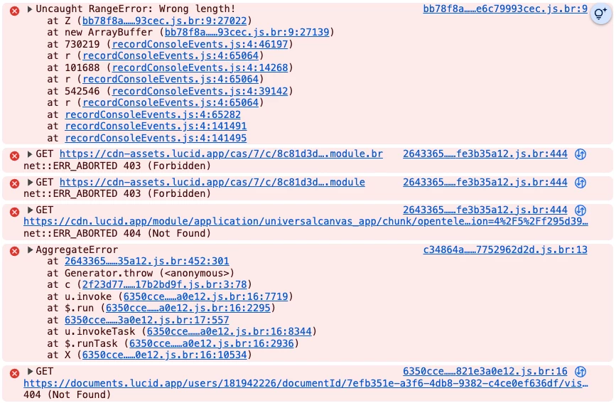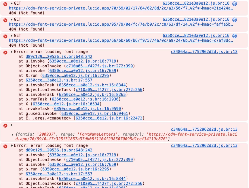 If I reload the lucidchart page, I also see a significant quantity of console errors before the font drop-down is invoked. I wonder if there is something more significantly wrong that is impacting the font availability?