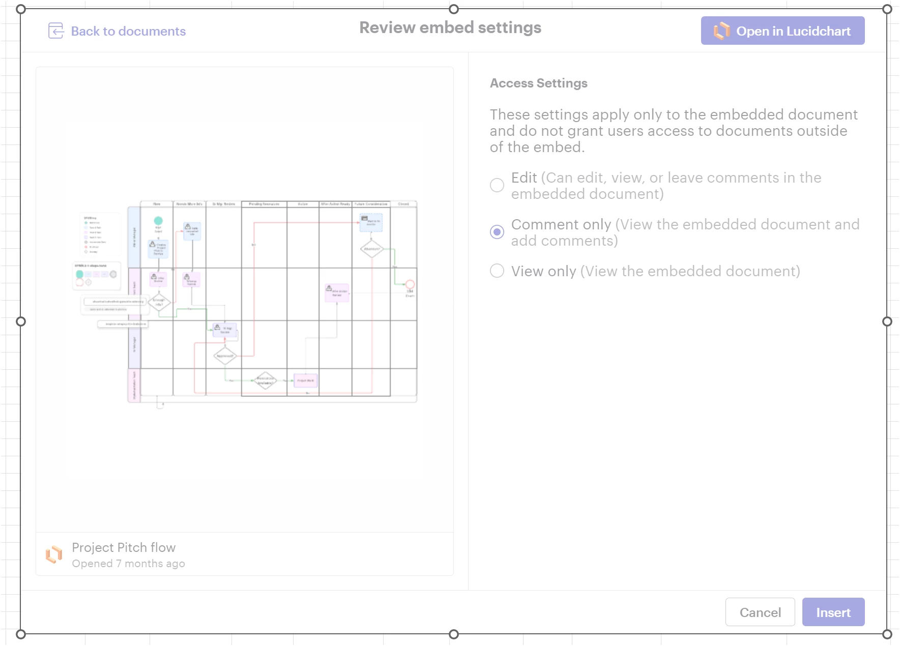 When using the “Comment only” option and pressing the Insert button the embed panel becomes greyed out, and it just sits there doing nothing. You have to find the Lucid control button in the top left corner to be able to delete the panel from the screen, or right click on the panel to do refresh, go through the document selection process again. 2nd time through it looks like its working, but it just sits with the splash screen and the orange progress bar that gets to about 85/90 % and stays there.