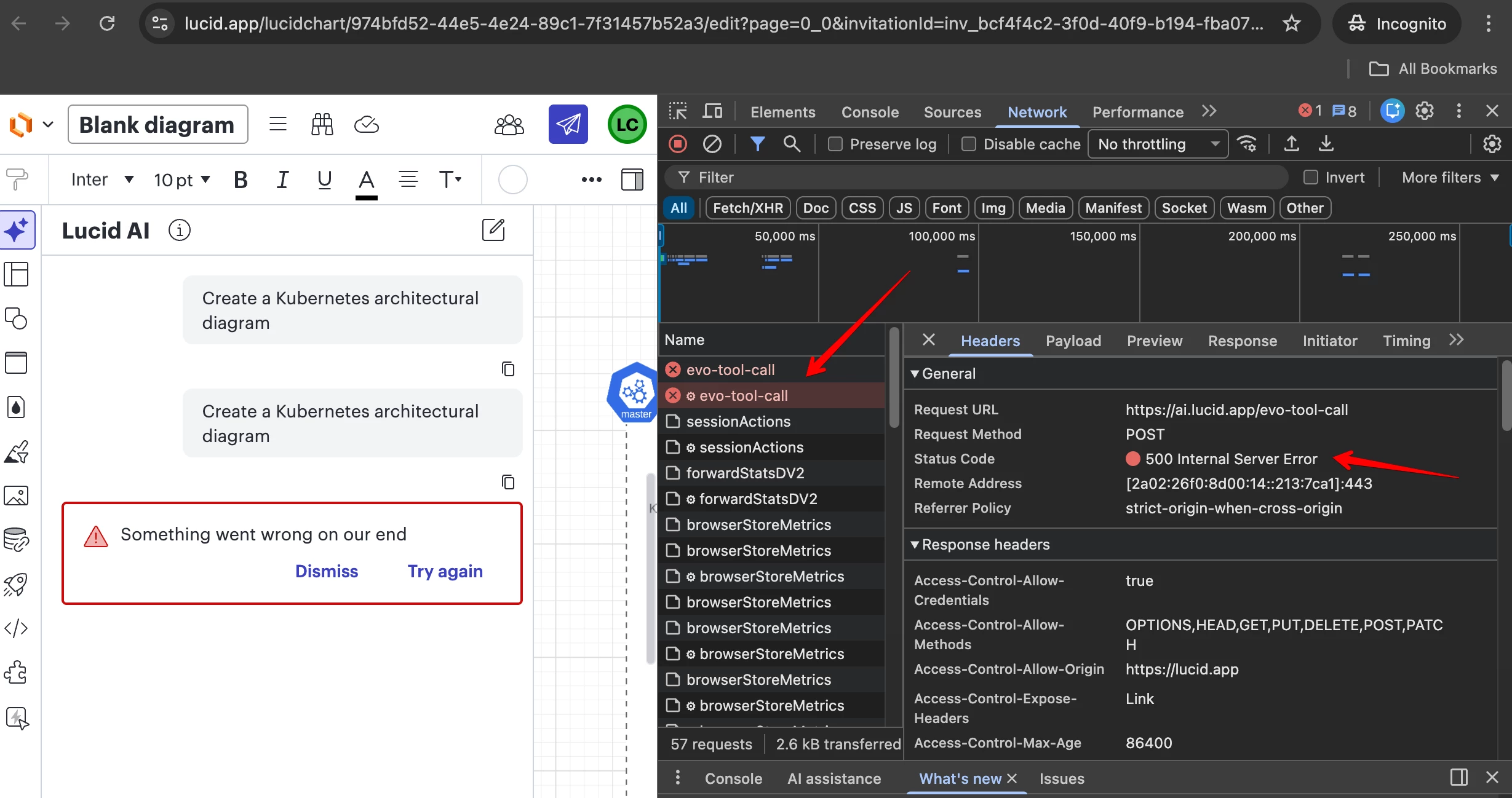 when submitting an AI prompt on Lucidchart I only get the error “Something went wrong on our end”. I tested it on different browsers, and in incognito but the error is the same.