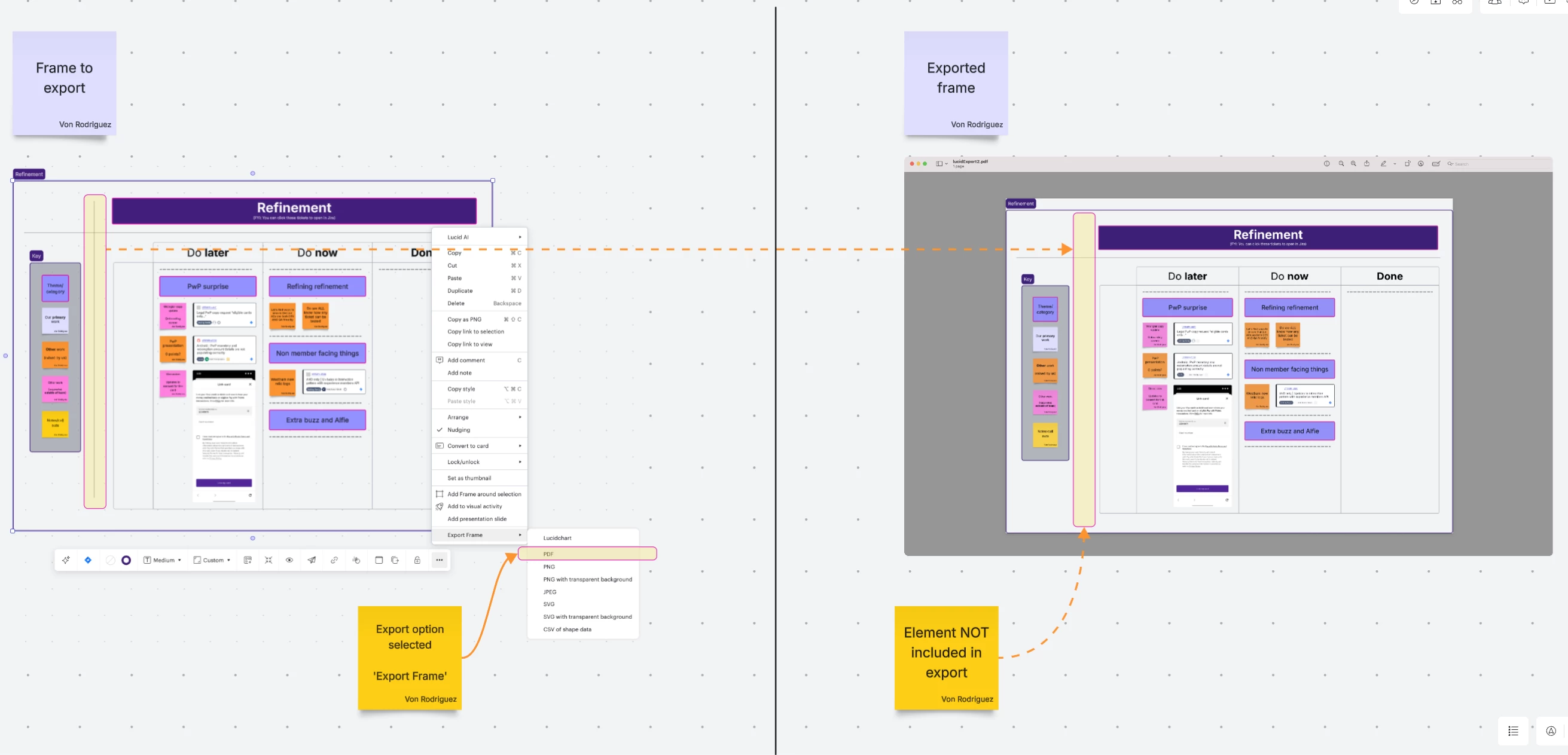 - When exporting a frame with contents (eg screenshots, post it notes etc), selected items are EXCLUDED from the PDF