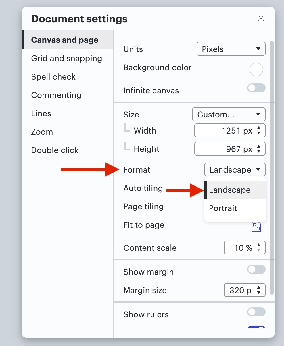 Option 3: In your Document Settings, change format from Portrait to Landscape, or whichever fits your document best. You can also change the Content scale.