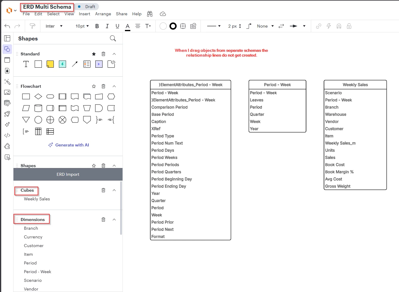 Here's what it looks like when we import from an ERD that has multiple schemas. Note: The issue is that the relationship lines are not drawn when the tables cross multiple schemas.
