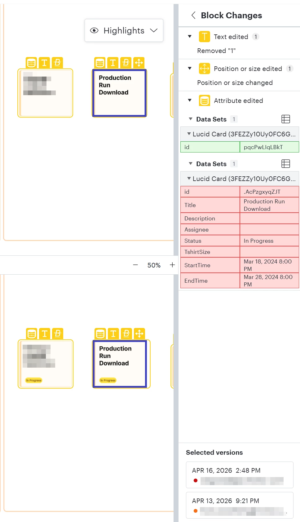 On the Lucid Chart side, I found history reflecting data changes on 80 objects (the whole board).