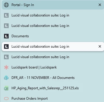 Hi - would love to preserve my sanity. Screen shot are my Browser Tabs (on left pane instead of top). All the Lucids just say Login. Would like for them to say the Board Name similar to the SharePoint, Excel,Power BI examples below so I know which Lucid tab that I need to navigate back to.
