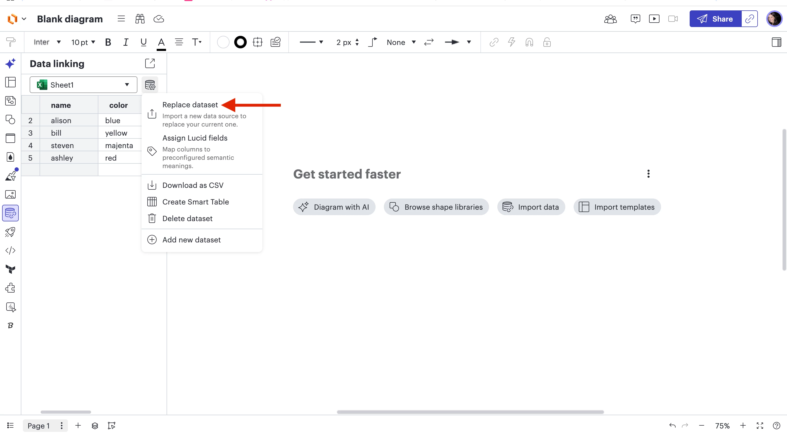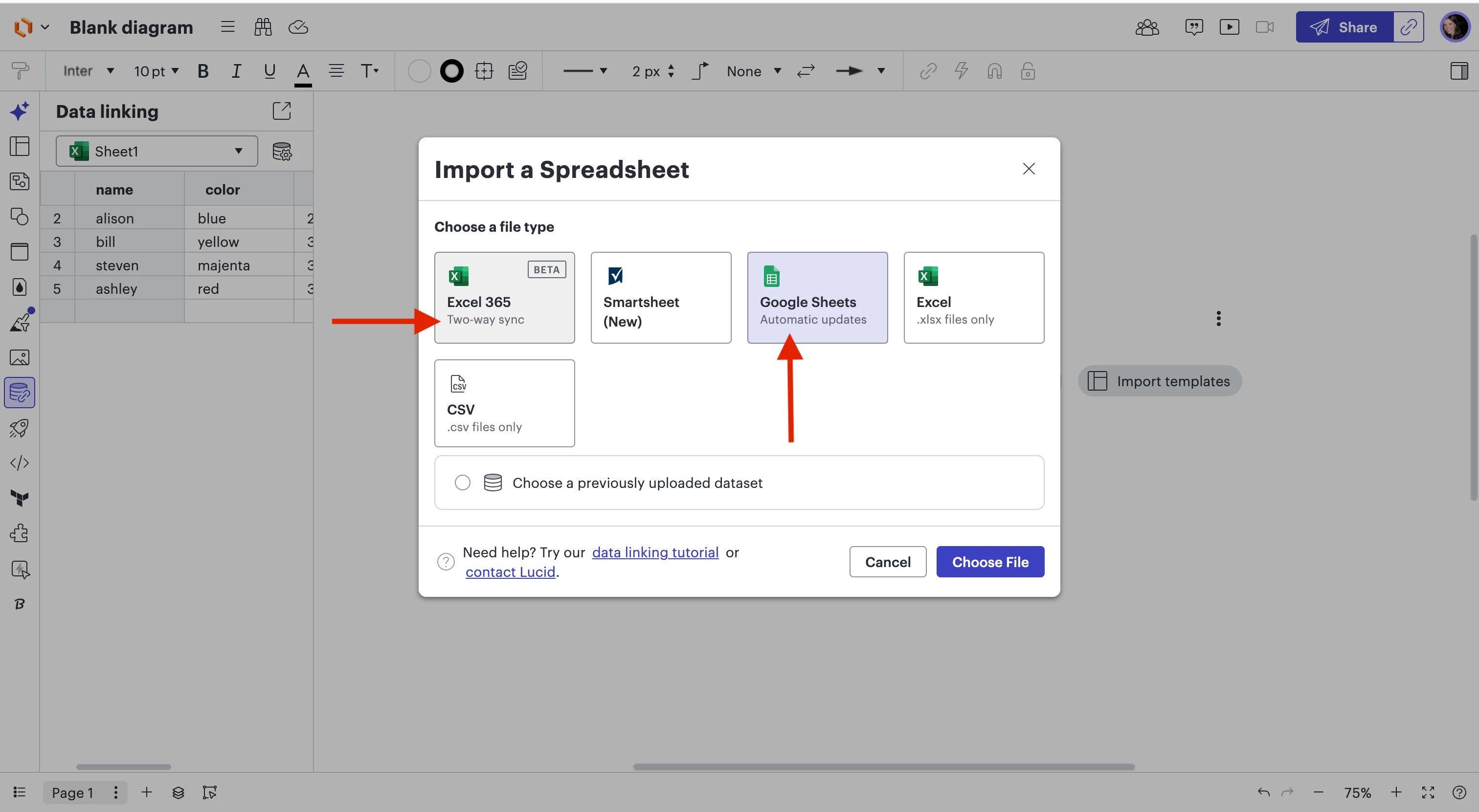 You can import and build an Org Chart one shape at a time using the shapes library or auto-create one by importing data. Our supported import types are Google Sheets Excel or CSV.