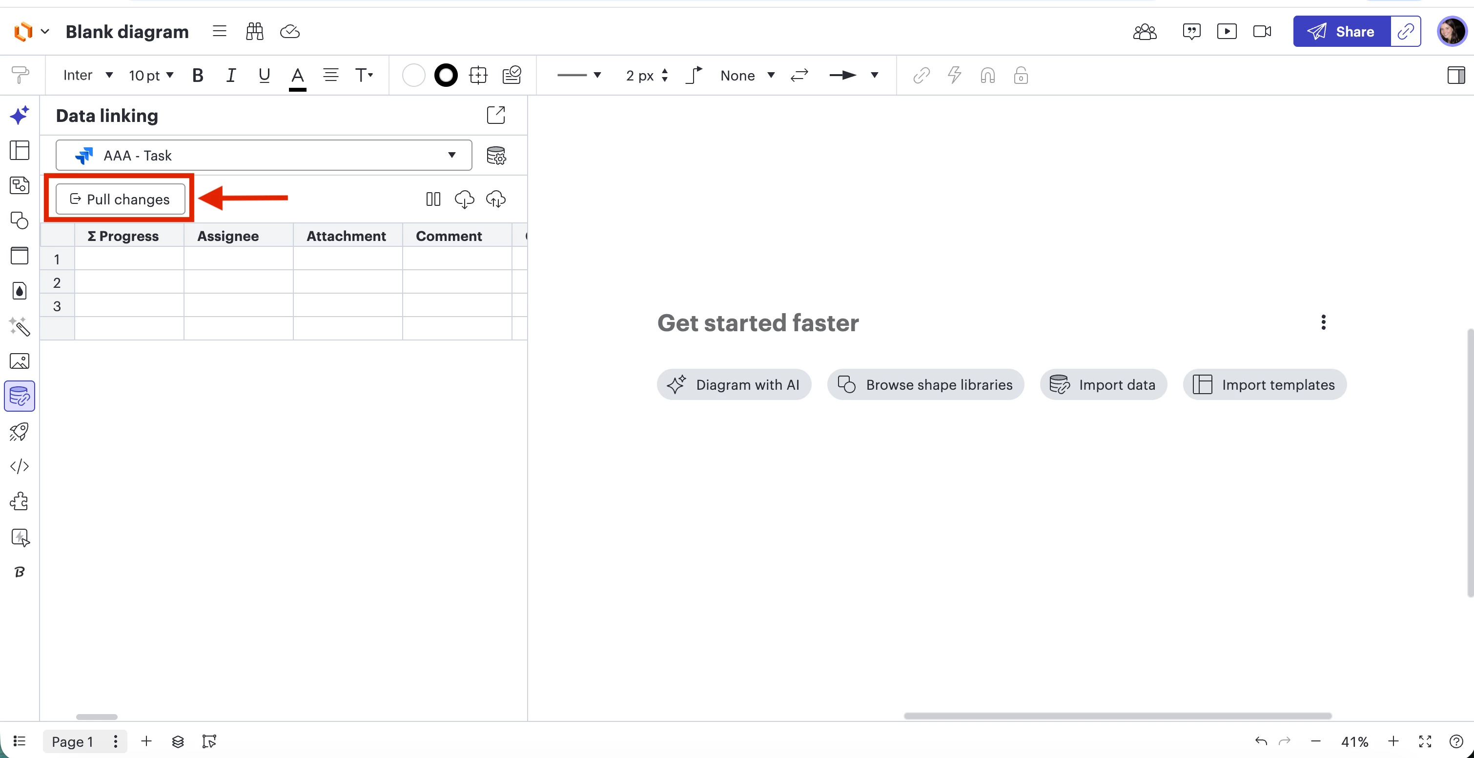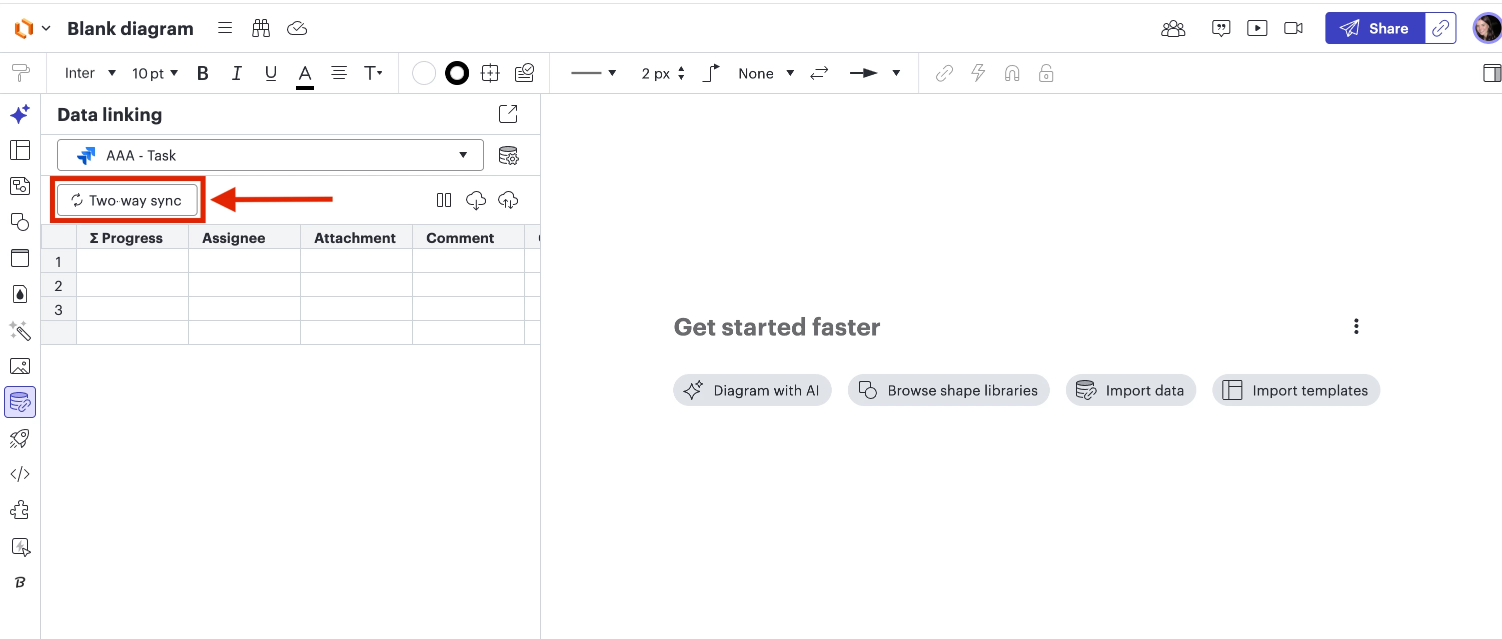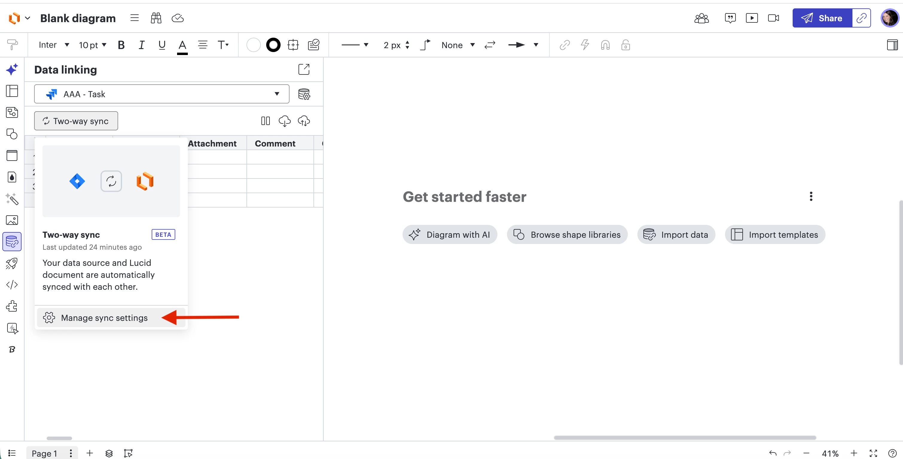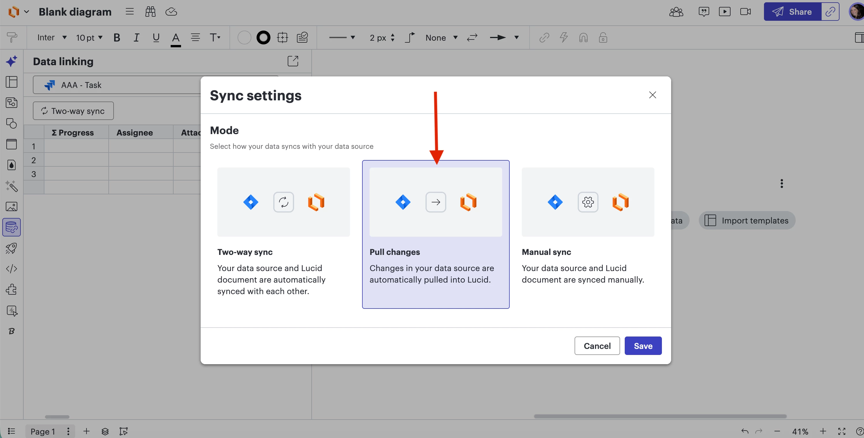I apologize for any confusion here. I included screenshots of my Lucidchart document below to show how it should show up for you. It is technically your Sync settings, but it will most likely show up as “Two-way sync” “Pull changes” or “Manual Sync”, depending on how you have your data set configured to Lucid. Please follow the steps below to change your Data linking settings to “Pull Changes”: