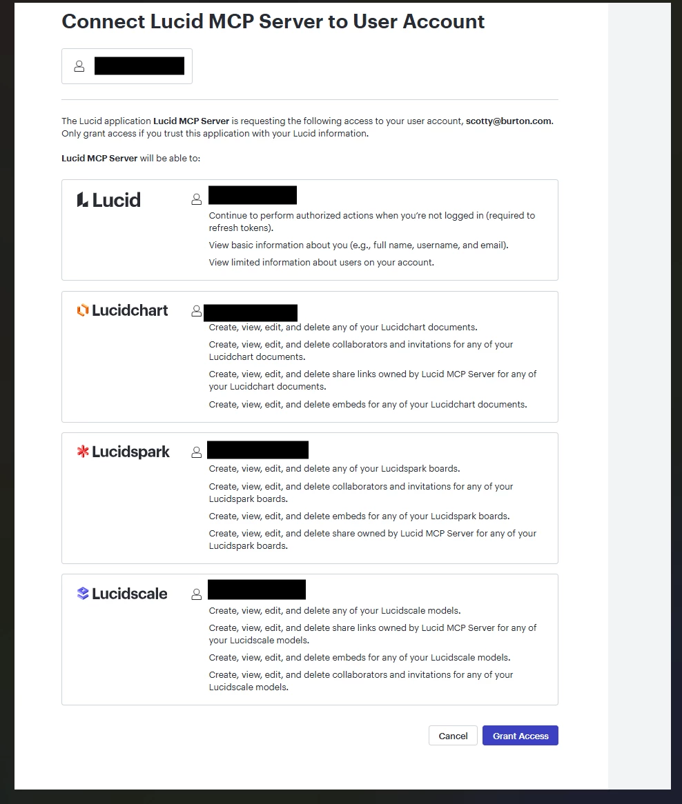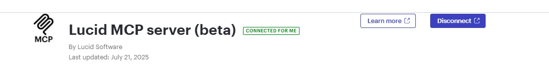 https://lucid.app/user#/appsAndIntegrations/lucidchart. Next to 'Lucid MCP Server', click the tri-dot menu and select 'Disconnect application'. This will ensure you'll go through the full connection flow again when you connect to the MCP server. Try the connection again.