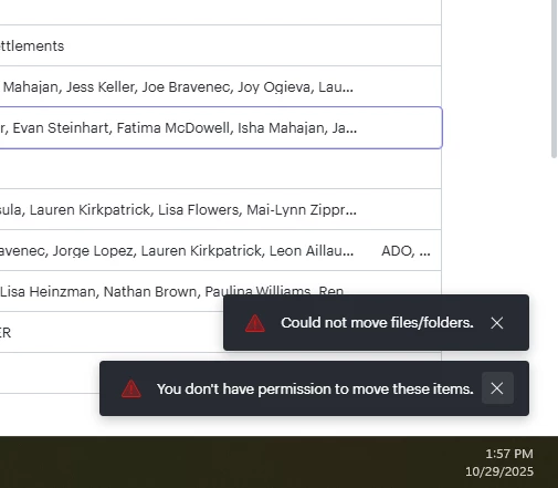 Thank you for providing that information that is very helpful! Based on the image you shared, it looks like you're on the right track with moving the document. Could you let me know exactly when the error appears? Does it happen after you click one of the dropdown menus and select the destination and click Move? If possible, please try the action again and share at what exact point the error message appears.
