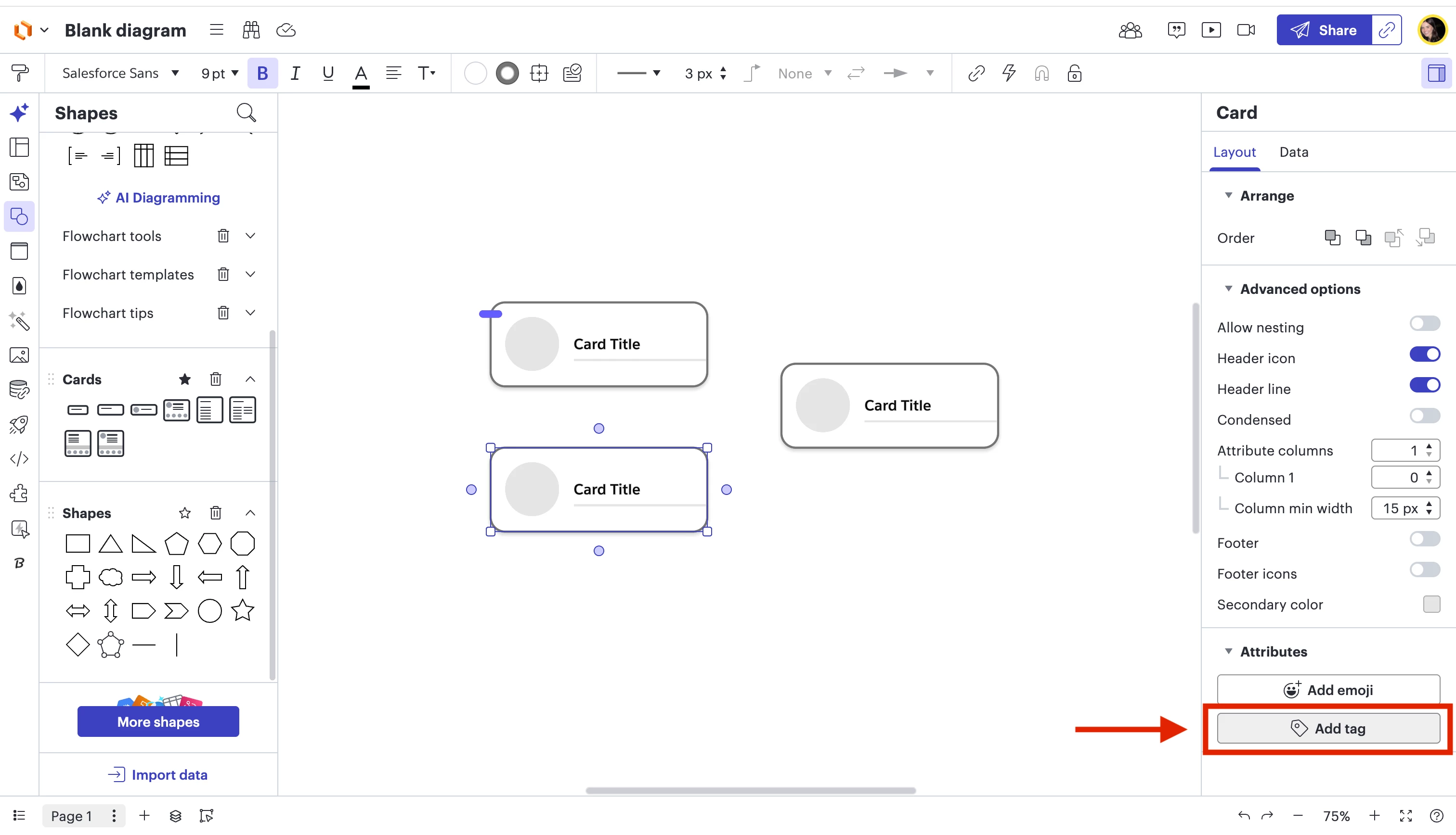 Is there a way to add a Tag to a Lucid Card in LucidChart. I see it in Lucid Spark, but not in Lucid Chart. the Attributes box in the top-right, does not have the option to add.