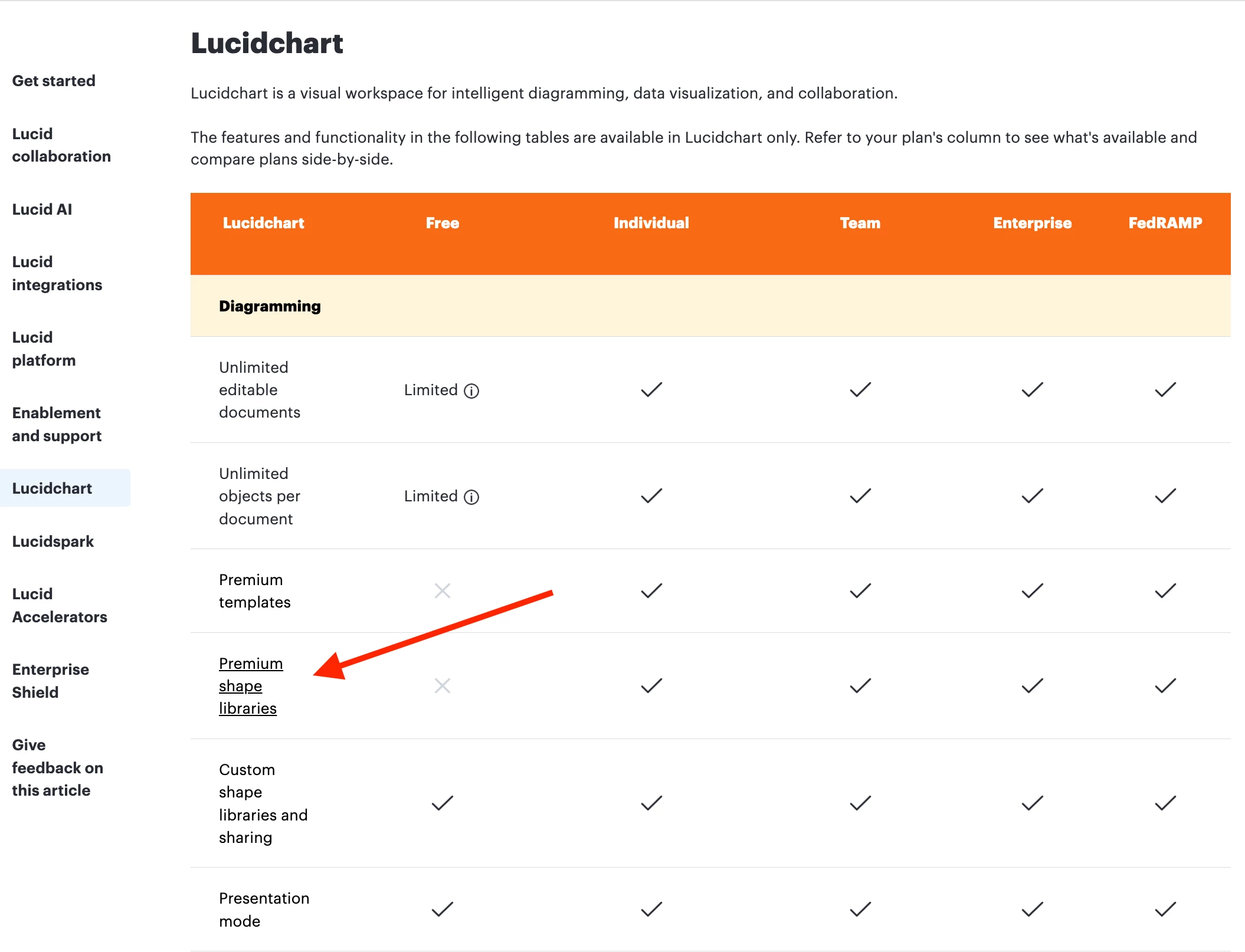 I have a chart that I've shared with coworkers giving them editing capabilities. I have a premium account and I can't tell which shapes are available for them to use with their free accounts.