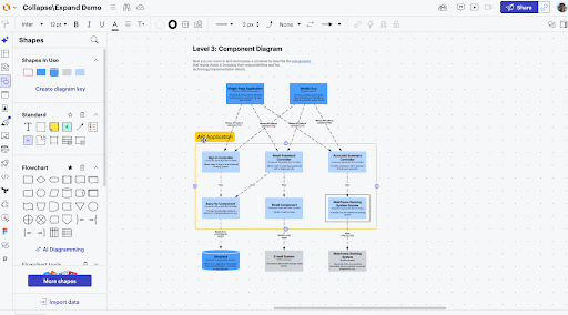 Quickly focus on the bigger picture as you collapse and expand your diagrams in Lucid. Similar to minimizing a window on your desktop, the work doesn't go away; it’s just neatly tucked into a single container so you can zoom out or zoom in on necessary details. This feature is compatible with basic container types like Frames, rectangle, rounded rectangle, pill, circle and spark containers, as well as containers with assisted layout. Learn more in this help center article and this community post.