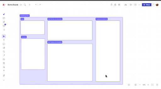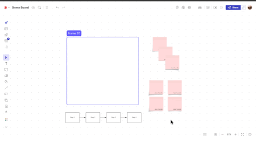 Ask Lucid AI to draft a board that has Frames, sticky notes, and text titles. Learn more.