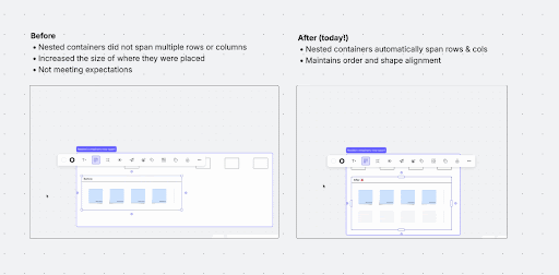 Effortlessly organize content using assisted layout. You can span an object, Frame, Container, or swimlane over multiple cells in an assisted layout grid or hold Cmd/Cntrl to activate spacing handles on any currently nested Containers to have them span. You can also pull grouped objects into assisted layouts. Learn more.